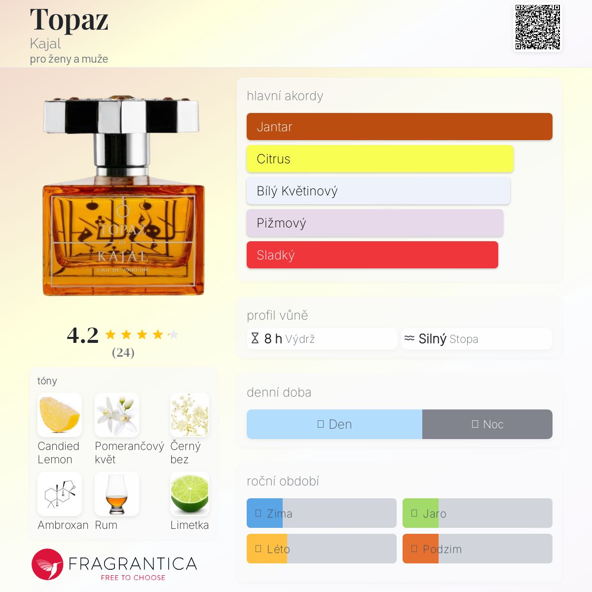 Topaz podle Kajal je Orientální Floral vůně pro ženy a muže. Toto je nová vůně. Topaz byl/a uveden/a v roce 2025. "Nosem" za touto vůní je Vincent Ricord. Vrchní tóny jsou Pomerančový květ, Černý bez, Rum a Limetka; střední tóny jsouKandovaný citron , Růže, Černý rybíz a Cedr ; základní tóny jsou Ambroxan, Ambra, Kašmírové dřevo a Pižmo.