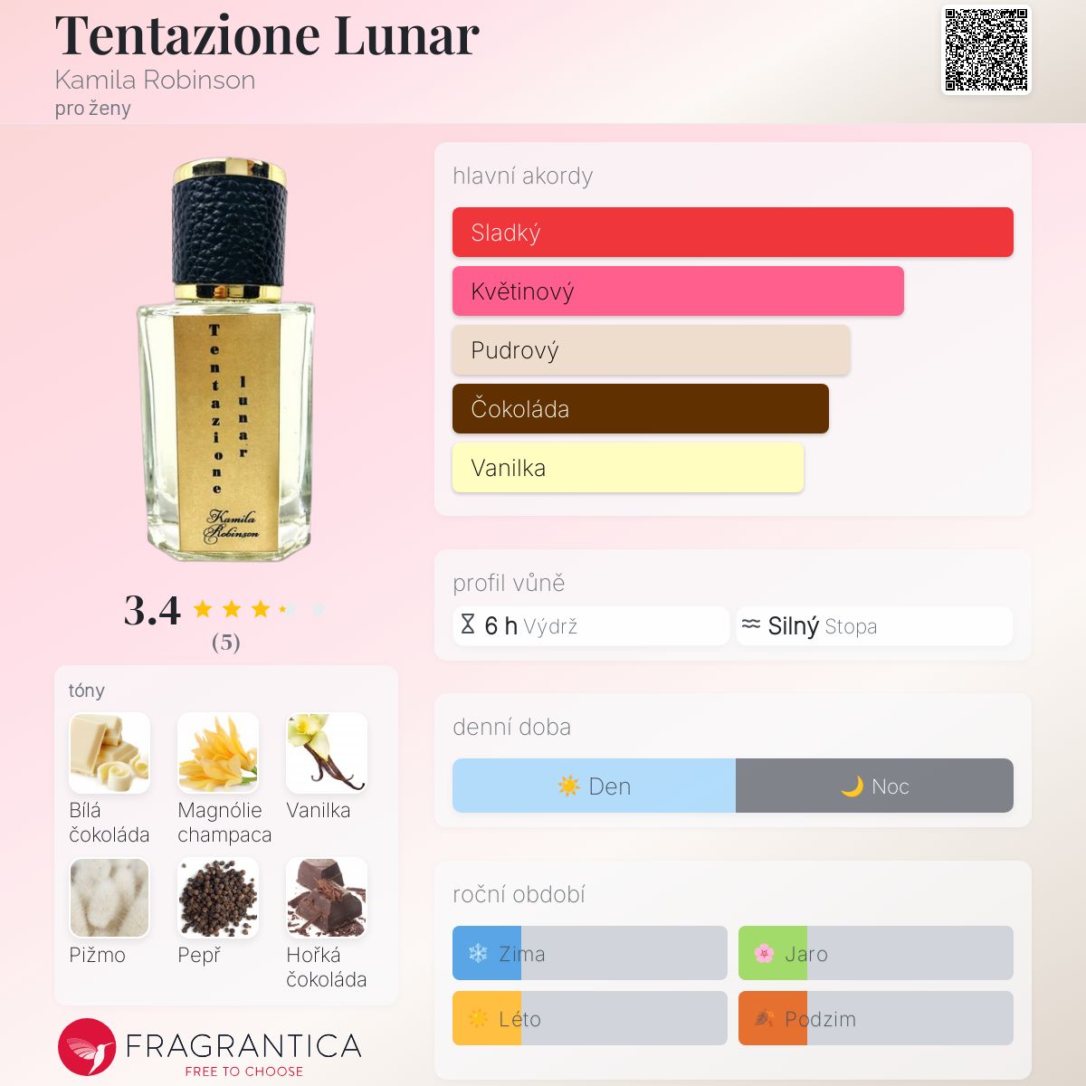 Tentazione Lunar podle Kamila Robinson je Orientální Vanilla vůně pro ženy. Tentazione Lunar byl/a uveden/a v roce 2021. "Nosem" za touto vůní je Kamila Robinson. Vrchní tóny jsou Magnólie champaca, Černý pepř a Skořice; střední tóny jsouBílá čokoláda, Čokoláda, Lískový oříšek a Orchidej ; základní tóny jsou Bourbonská vanilka, Pižmo a Kosatec.