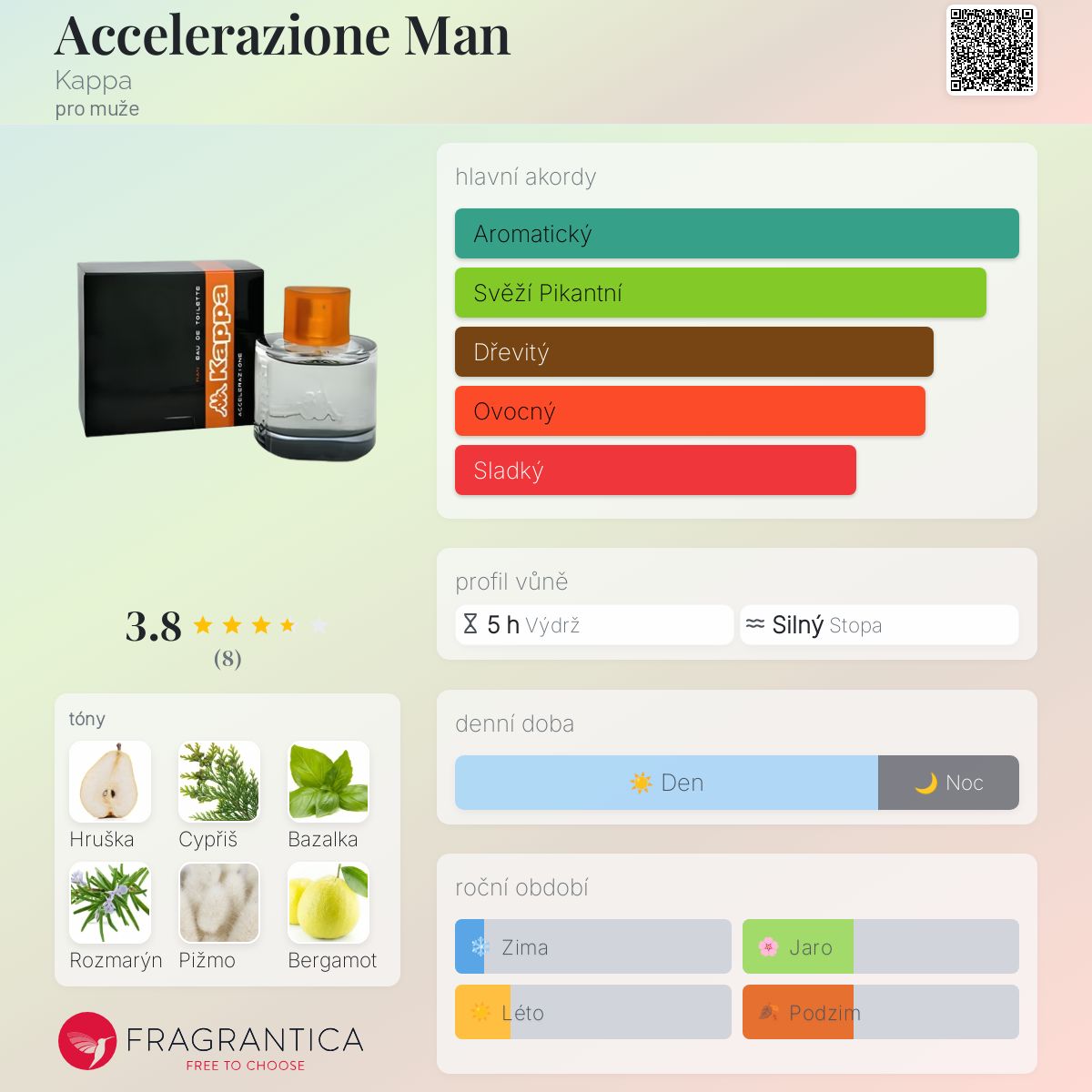 Accelerazione Man podle Kappa je Woody Aromatic vůně pro muže. Accelerazione Man byl/a uveden/a v roce 2010. Vrchní tóny jsou Hruška, Bazalka a Bergamot; střední tóny jsouCypřiš a Rozmarýn ; základní tóny jsou Pižmo a Virginský cedr.