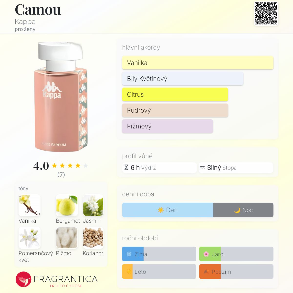Camou podle Kappa je Floral vůně pro ženy. Toto je nová vůně. Camou byl/a uveden/a v roce 2022. "Nosem" za touto vůní je Cristiano Canali. Vrchní tóny jsou Bergamot a Koriandr; střední tóny jsouJasmín a Pomerančový květ ; základní tóny jsou Vanilka a Pižmo.