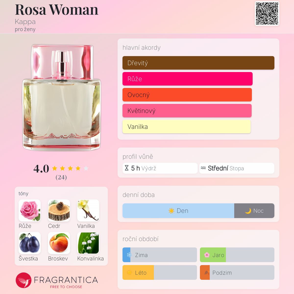 Rosa Woman podle Kappa je Floral Fruity vůně pro ženy. Rosa Woman byl/a uveden/a v roce 2010. Vrchní tóny jsou Švestka, Broskev a Frézie; střední tóny jsouRůže, Konvalinka, Jasmín a Ylang-Ylang ; základní tóny jsou Virginský cedr, Vanilka, Santalové dřevo, Fazole tonka a Káva.