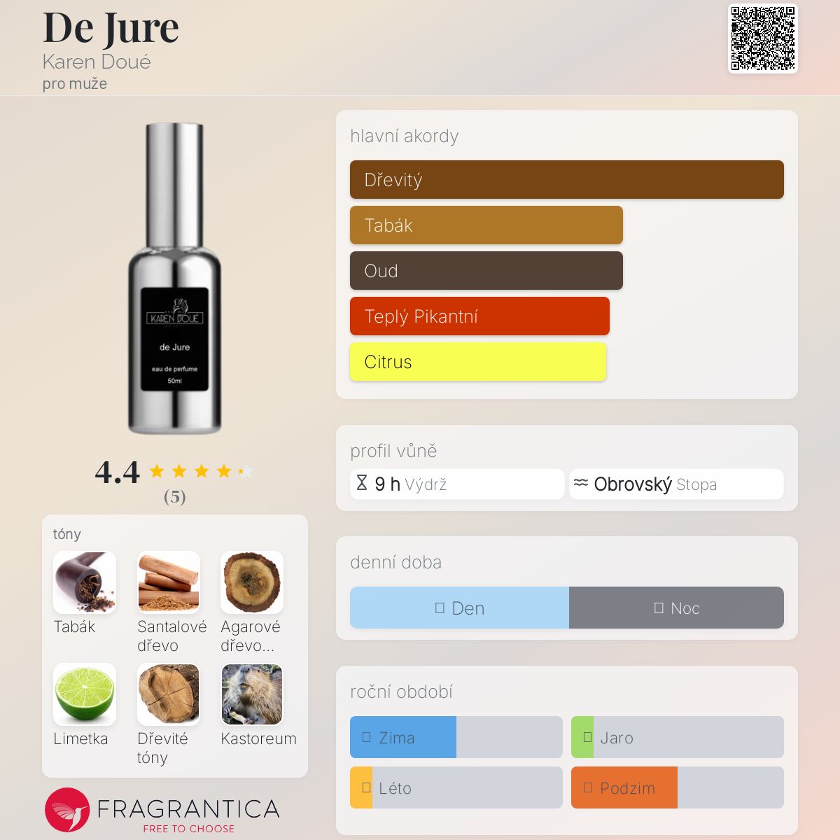 De Jure podle Karen Doué je Leather vůně pro muže. De Jure byl/a uveden/a v roce 2012. "Nosem" za touto vůní je Anna Shevchuk. Vrchní tóny jsou Limetka, Dřevité tóny, Ylang-Ylang a Bergamot; střední tóny jsouTabák, Káva, Dubový mech a Kadidlo ; základní tóny jsou Santalové dřevo, Agarové dřevo (oud) a Kastoreum.