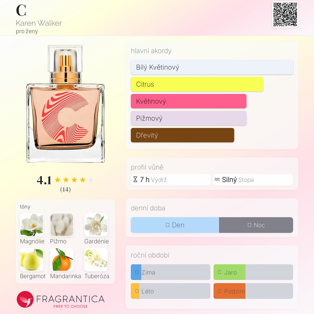 C podle Karen Walker je Orientální Floral vůně pro ženy. C byl/a uveden/a v roce 2015. Vrchní tóny jsou Magnólie, Gardénie, Bergamot a Mandarinka; střední tóny jsouTuberóza, Pomerančový květ, Jasmín Sambac a Konvalinka ; základní tóny jsou Pižmo, Santalové dřevo, Jantar (ambra) a Kašmírové dřevo.