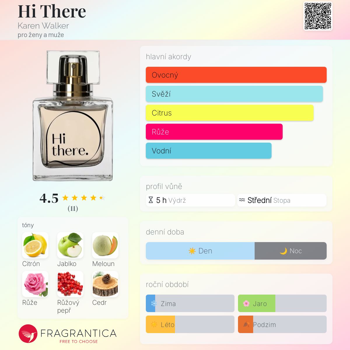 Hi There podle Karen Walker je Floral Fruity vůně pro ženy a muže. Hi There byl/a uveden/a v roce 2016. Vrchní tóny jsou Italský citrón, Zelené jablko, Meloun a Růžový pepř; střední tóny jsouBílá růže, Broskev a Konvalinka ; základní tóny jsou Cedr a Jantar (ambra).
