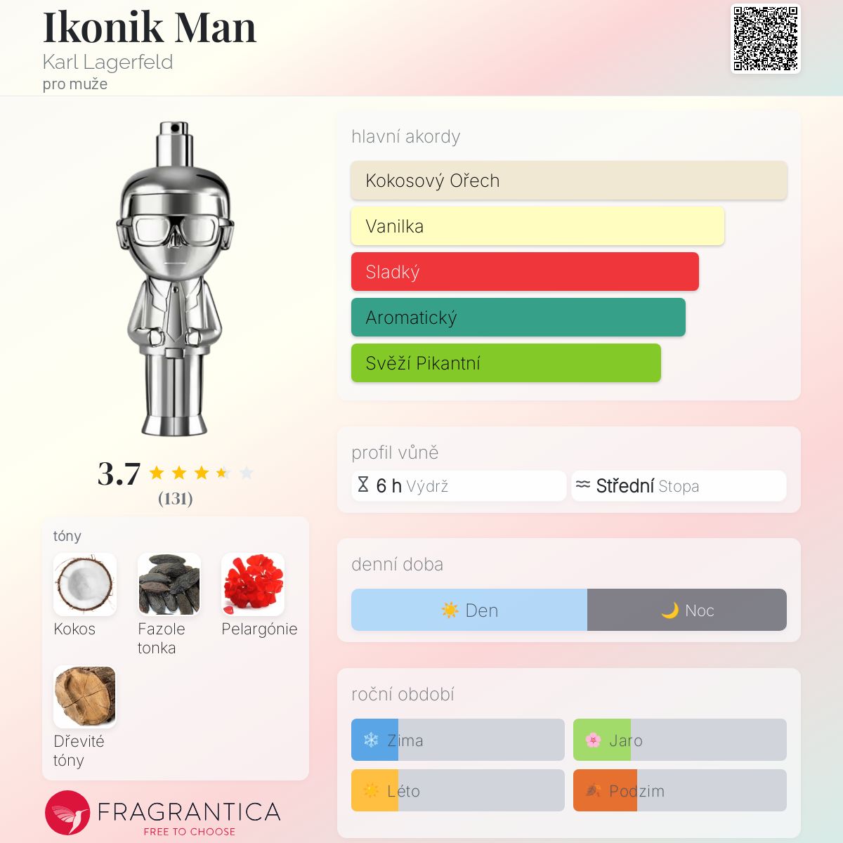 Ikonik Man podle Karl Lagerfeld je Orientální Fougere vůně pro muže. Toto je nová vůně. Ikonik Man byl/a uveden/a v roce 2024. Vrchní tón je Pelargónie ; střední tón jeKokosový list ; základní tóny jsou Fazole tonka a Dřevité tóny.