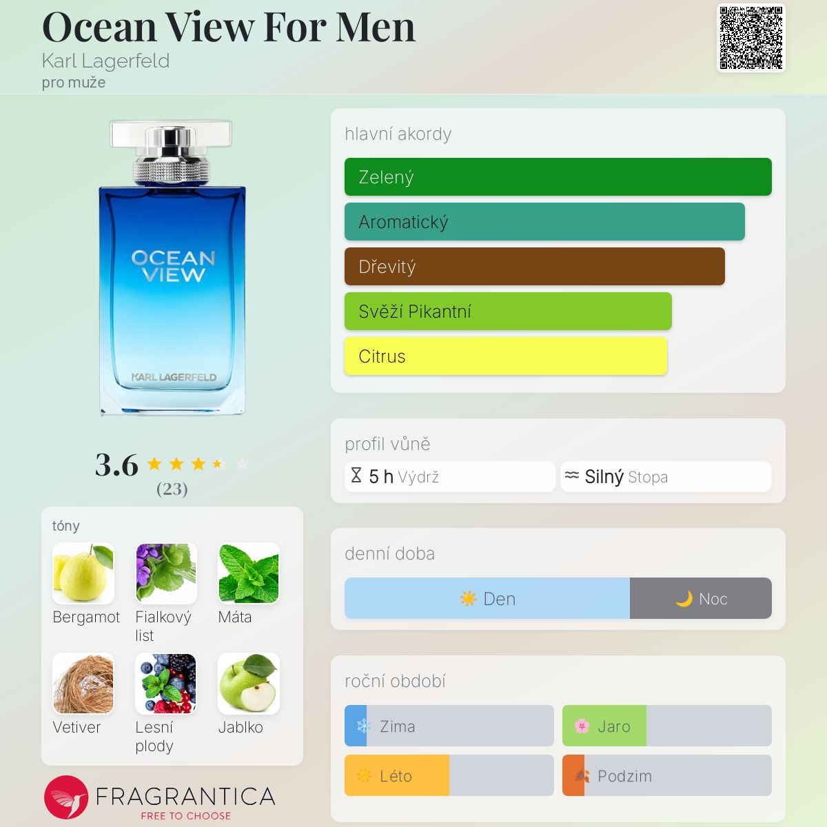Ocean View For Men podle Karl Lagerfeld je Woody Aromatic vůně pro muže. Ocean View For Men byl/a uveden/a v roce 2016. "Nosem" za touto vůní je Jean-Christophe Hérault. Vrchní tóny jsou Bergamot, Fialkový list a Máta; střední tóny jsouLesní plody a Zelené jablko ; základní tóny jsou Vetiver a Kašmír.