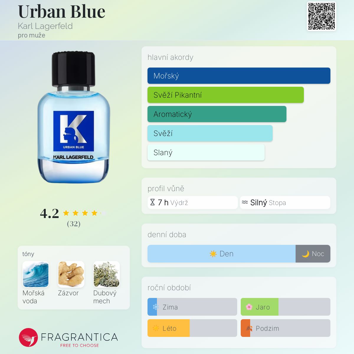 Urban Blue podle Karl Lagerfeld je Aromatic Aquatic vůně pro muže. Toto je nová vůně. Urban Blue byl/a uveden/a v roce 2025. Vrchní tón je Zázvor ; střední tón jeMořské tóny ; základní tón je Mech.