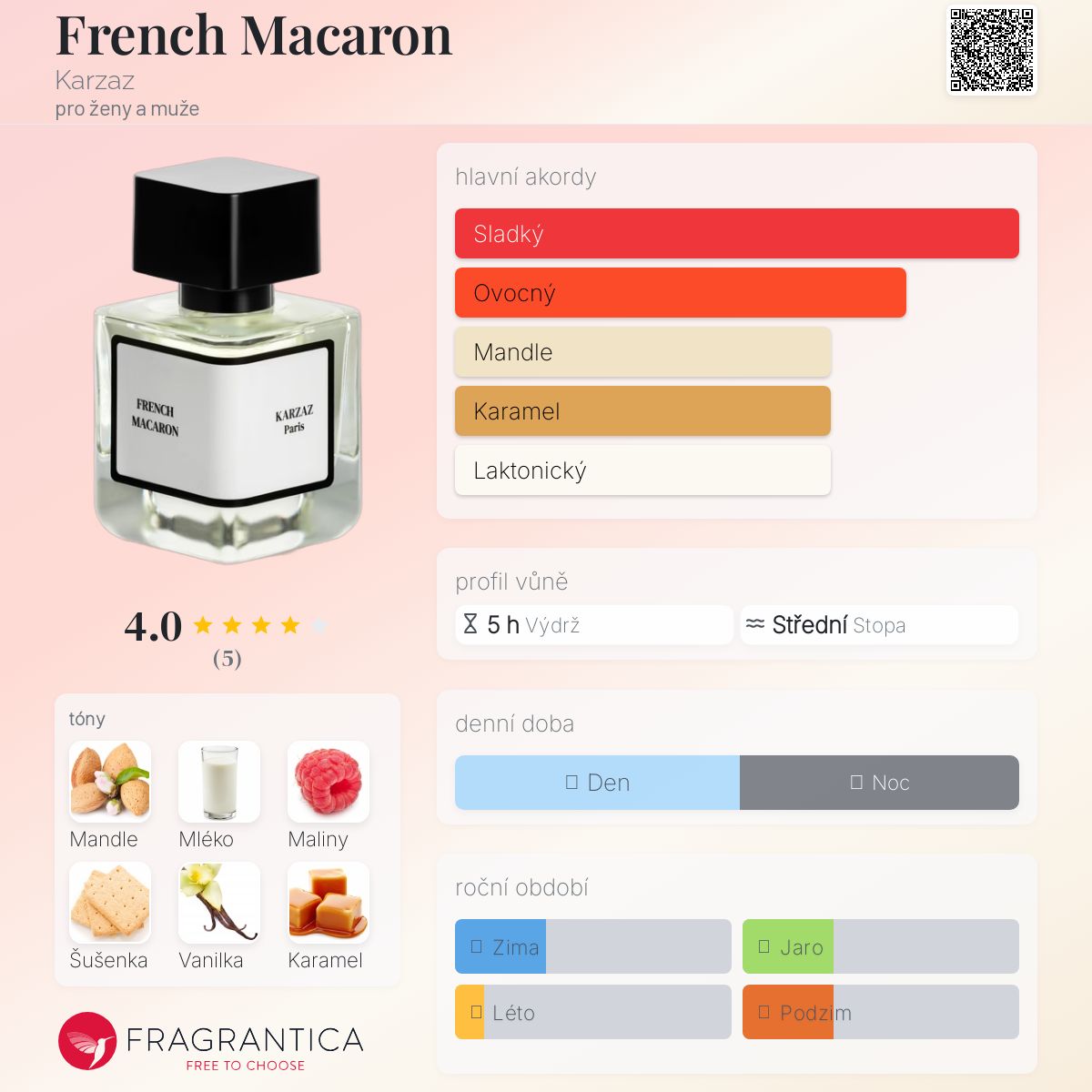 French Macaron podle Karzaz je Orientální Vanilla vůně pro ženy a muže. Toto je nová vůně. French Macaron byl/a uveden/a v roce 2025. "Nosem" za touto vůní je Xavier Blaizot. Vrchní tóny jsou Mandle a Mléko; střední tóny jsouMaliny a Šušenka ; základní tóny jsou Vanilka a Karamel.