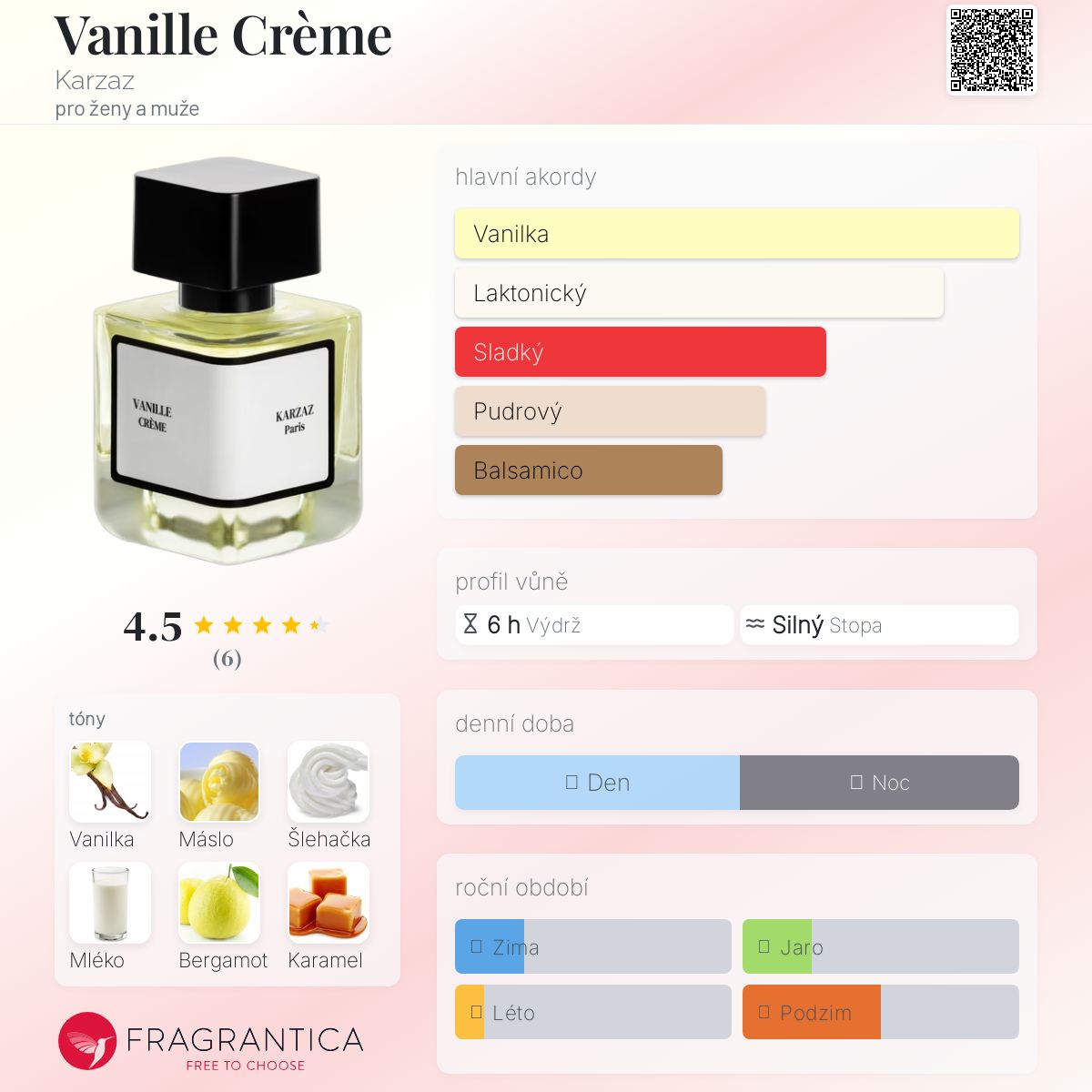 Vanille Crème podle Karzaz je Orientální Vanilla vůně pro ženy a muže. Toto je nová vůně. Vanille Crème byl/a uveden/a v roce 2025. "Nosem" za touto vůní je Xavier Blaizot. Vrchní tóny jsou Vanilka, Šlehačka a Bergamot; střední tóny jsouMáslo, Mléko a Karamel ; základní tóny jsou Vanilka, Cukr a Pižmo.