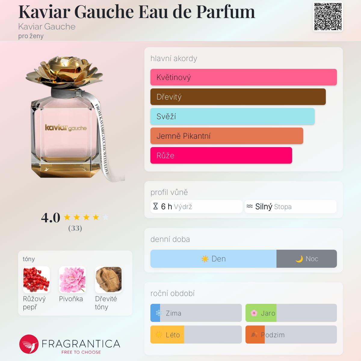 Kaviar Gauche Eau de Parfum podle Kaviar Gauche je Floral vůně pro ženy. Kaviar Gauche Eau de Parfum byl/a uveden/a v roce 2019. Vrchní tón je Růžový pepř ; střední tón jePivoňka ; základní tón je Dřevité tóny.