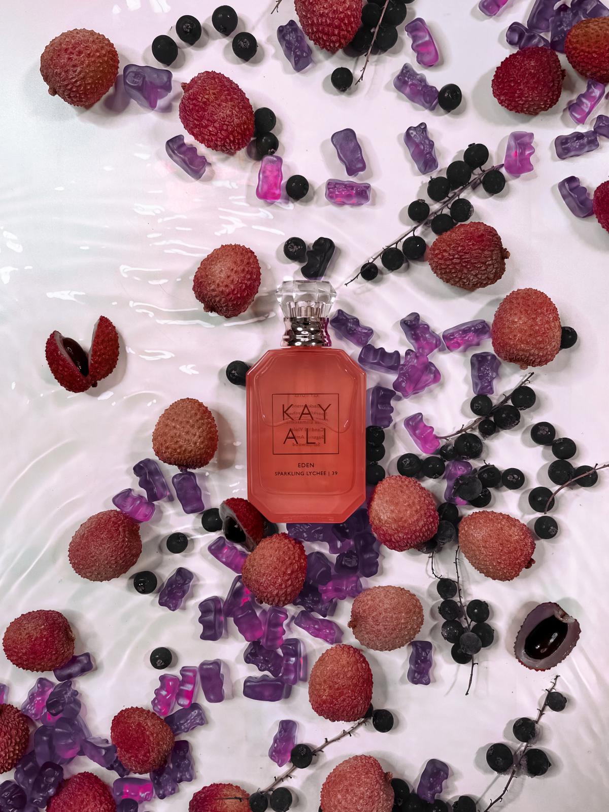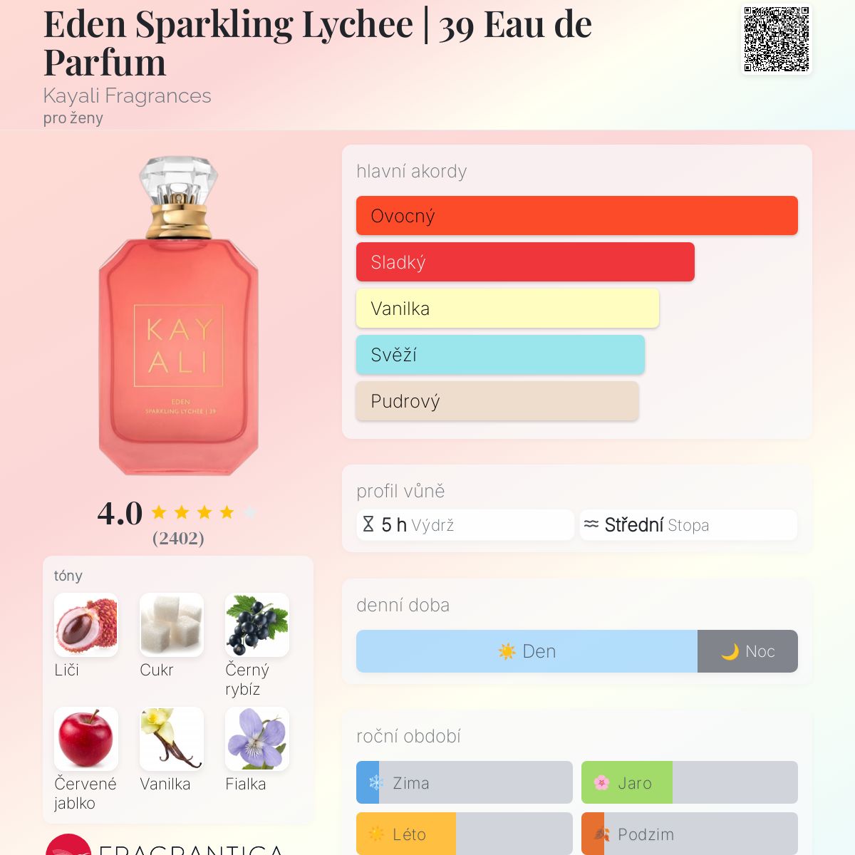 Eden Sparkling Lychee | 39 Eau de Parfum podle Kayali Fragrances je Floral Fruity vůně pro ženy. Eden Sparkling Lychee | 39 Eau de Parfum byl/a uveden/a v roce 2023. "Nosem" za touto vůní je Gabriela Chelariu. Vrchní tóny jsou Liči, Černý rybíz, Červené jablko a Italský citrón; střední tóny jsouFialka, Růže a Jasmín Sambac ; základní tóny jsou Cukr, Vanilka, Pižmo, Jantar (ambra), Santalové dřevo a Cedr.