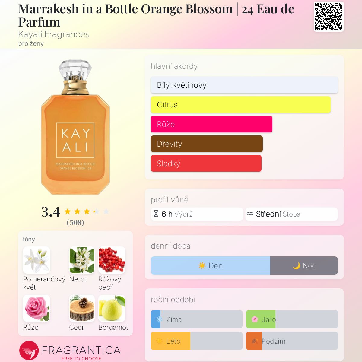 Marrakesh in a Bottle Orange Blossom | 24 Eau de Parfum podle Kayali Fragrances je Orientální Floral vůně pro ženy. Toto je nová vůně. Marrakesh in a Bottle Orange Blossom | 24 Eau de Parfum byl/a uveden/a v roce 2024. Vrchní tóny jsou Pomerančový květ, Růžový pepř a Bergamot; střední tóny jsouNeroli a Turecká růže ; základní tón je Cedr.