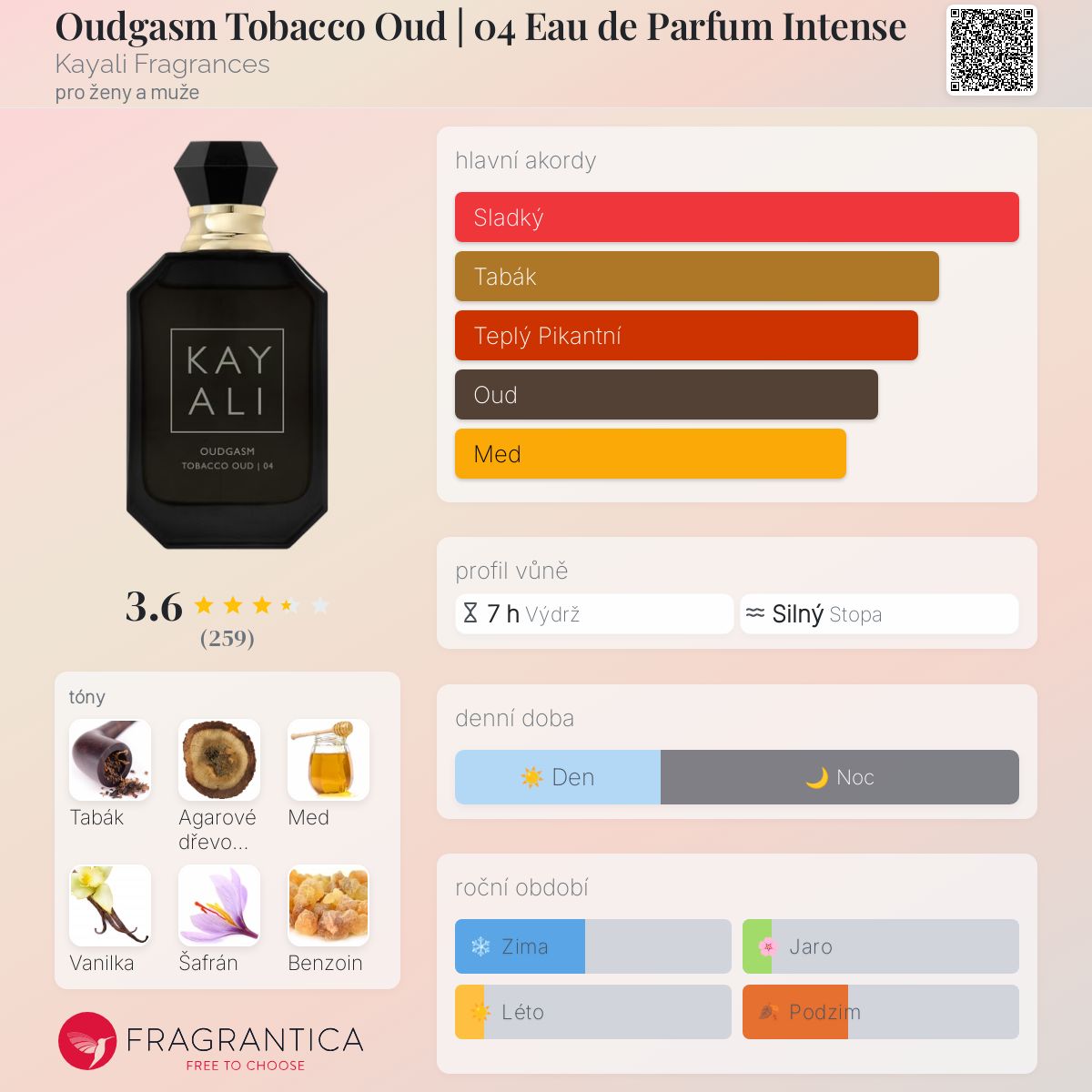 Oudgasm Tobacco Oud | 04 Eau de Parfum Intense podle Kayali Fragrances je vůně pro ženy a muže. Oudgasm Tobacco Oud | 04 Eau de Parfum Intense byl/a uveden/a v roce 2023. "Nosem" za touto vůní je Philippine Courtière. Vrchní tóny jsou Bílý med, Mandarinka, Šalvěj muškátová, Pelargónie a Švestka; střední tóny jsouŠafrán a Hřebíček ; základní tóny jsou Tabák, Agarové dřevo (oud), Vanilka, Benzoin, Pralinka a Pačuli.