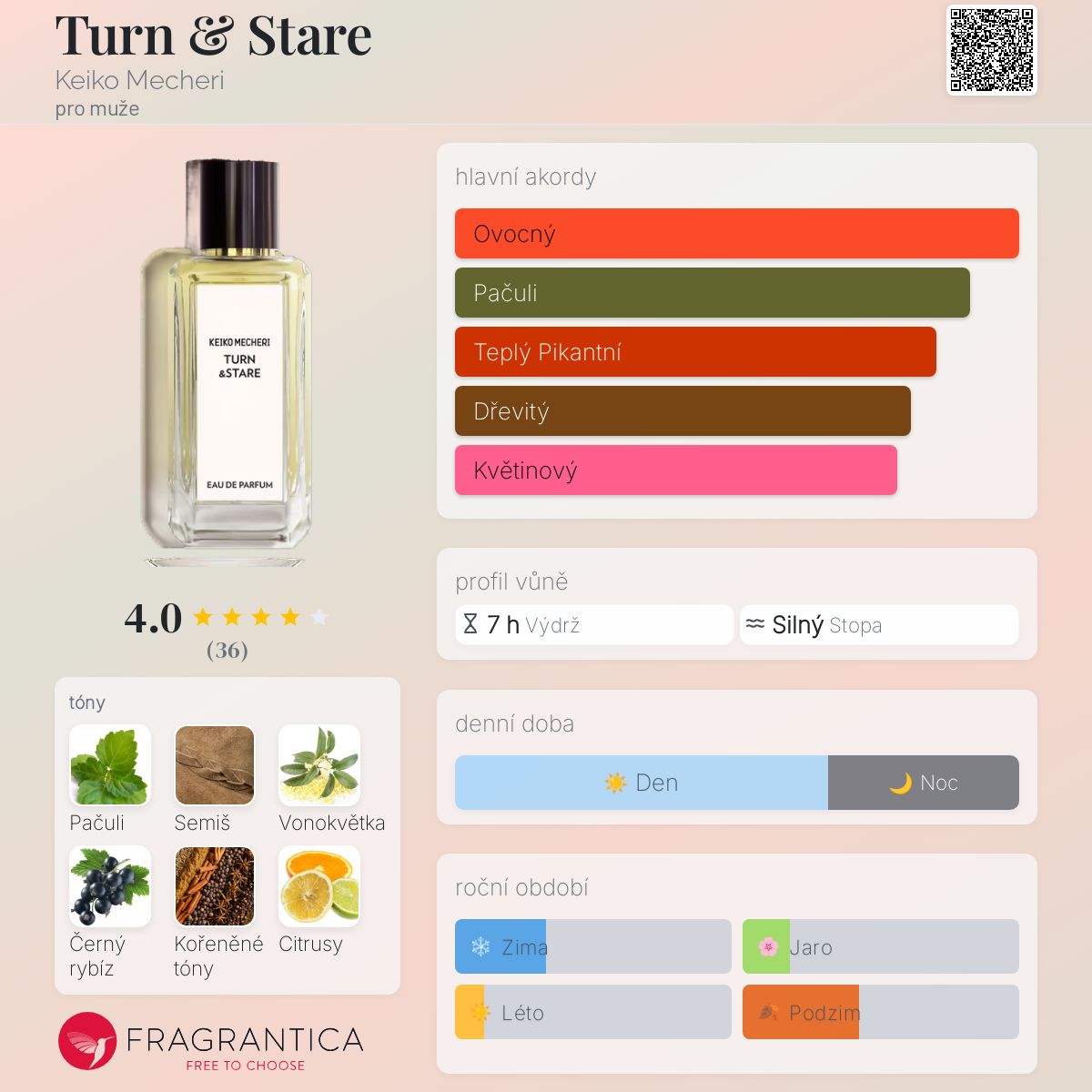 Turn & Stare podle Keiko Mecheri je Chypre Floral vůně pro muže. Turn & Stare byl/a uveden/a v roce 2018. "Nosem" za touto vůní je Keiko Mecheri.