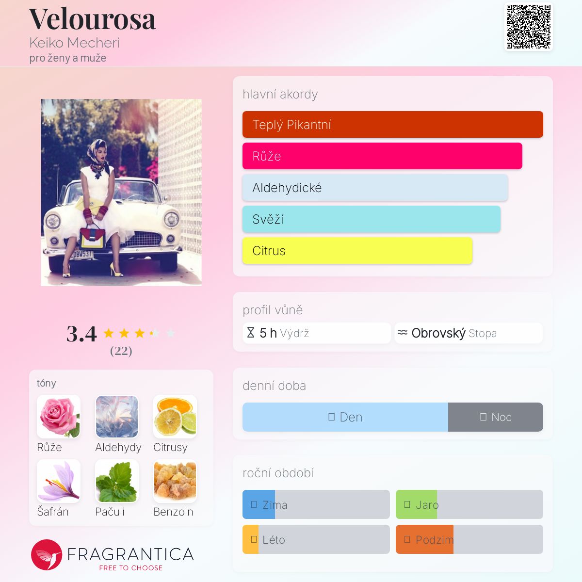 Velourosa podle Keiko Mecheri je Orientální Floral vůně pro ženy a muže. Velourosa byl/a uveden/a v roce 2015. Vrchní tóny jsou Aldehydy a Citrusy; střední tóny jsouRůže a Šafrán ; základní tóny jsou Pačuli a Benzoin.