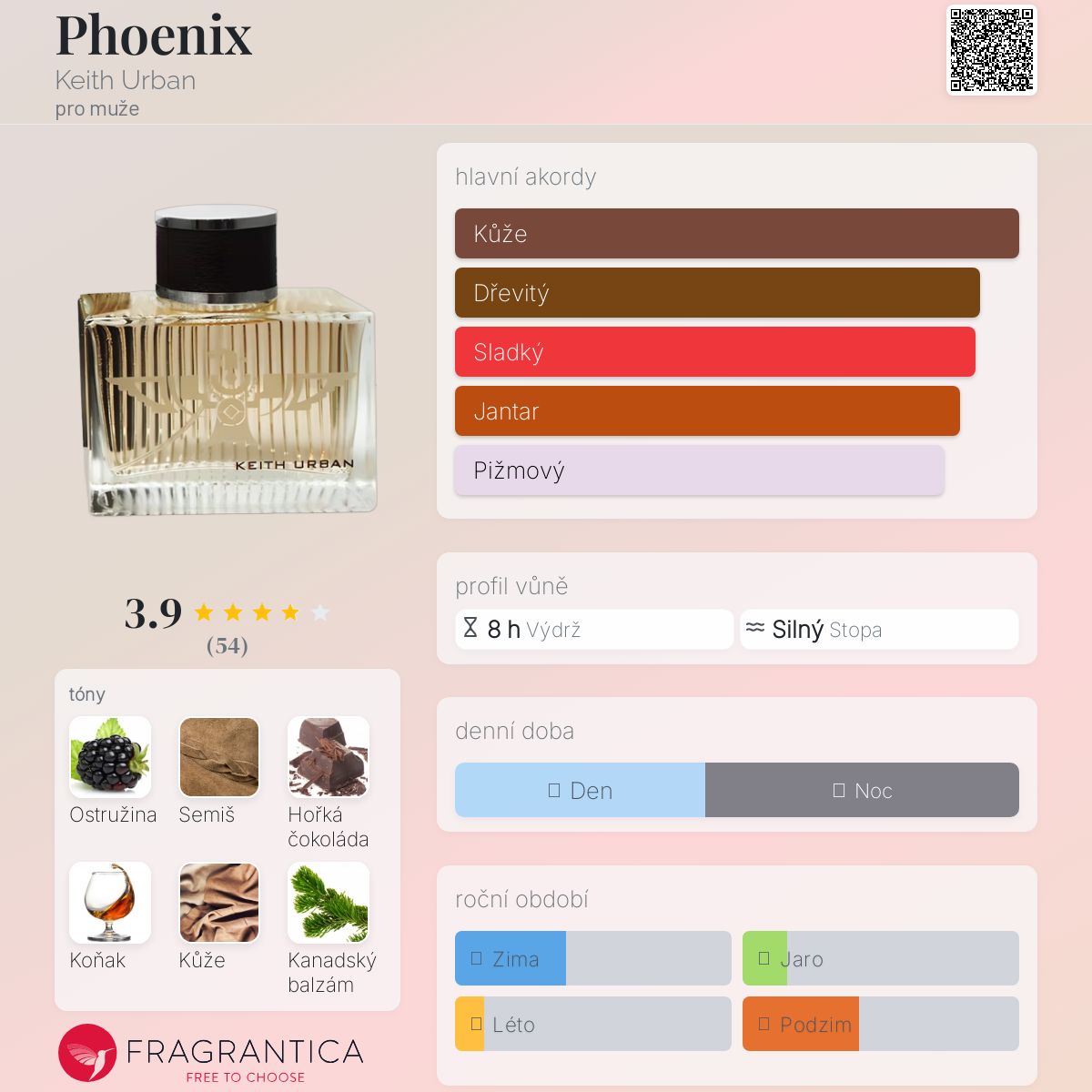 Phoenix podle Keith Urban je Leather vůně pro muže. Phoenix byl/a uveden/a v roce 2011. "Nosem" za touto vůní je Loc Dong. Vrchní tóny jsou Ostružina, Semiš a Koňak; střední tóny jsouMexická čokoláda, Kanadský balzám a Pižmo ; základní tóny jsou Kůže, Dřevité tóny, Fazole tonka a Jantar (ambra).