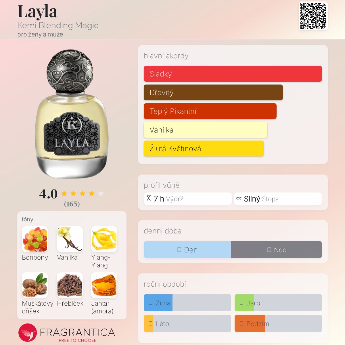 Layla podle Kemi Blending Magic je Orientální Spicy vůně pro ženy a muže. Layla byl/a uveden/a v roce 2014. "Nosem" za touto vůní je Chris Maurice. Vrchní tóny jsou Muškátový oříšek a Hřebíček; střední tóny jsouYlang-Ylang a Cedr ; základní tóny jsou Sladké tóny, Vanilka, Jantar (ambra), Pačuli a Pižmo.