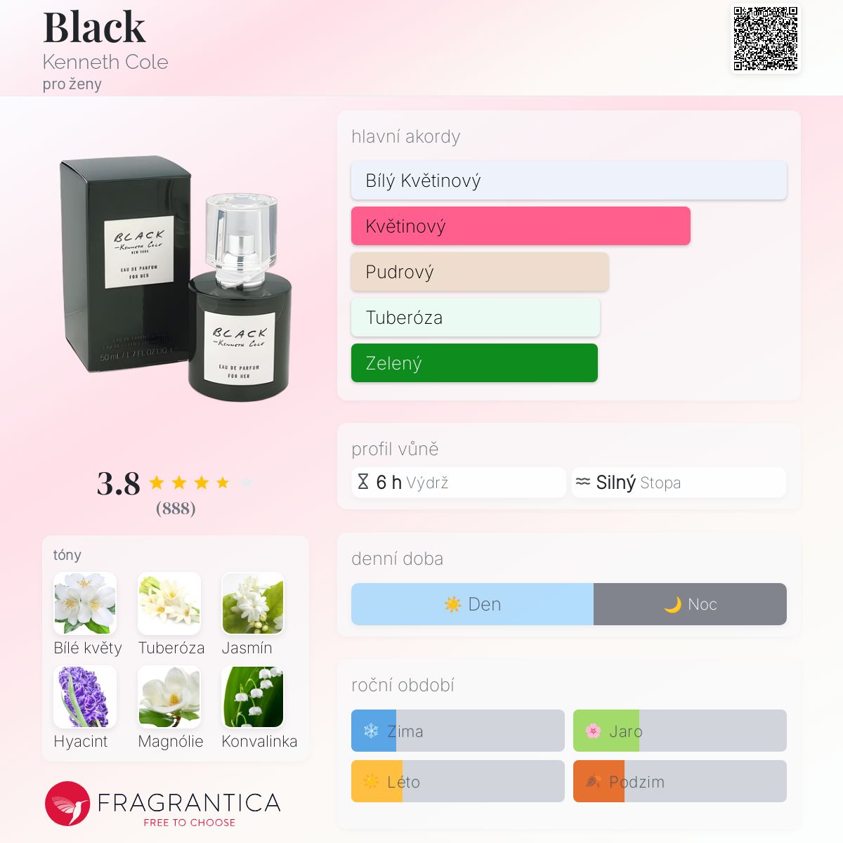 Black podle Kenneth Cole je Floral vůně pro ženy. Black byl/a uveden/a v roce 2004. "Nosem" za touto vůní je Amandine Clerc-Marie. Vrchní tóny jsou Fialka a Citrusy; střední tóny jsouBílé květy, Tuberóza, Jasmín, Hyacint, Magnólie, Konvalinka, Lotus, Ylang-Ylang a Kosatec ; základní tóny jsou Pižmo, Santalové dřevo a Jantar (ambra).