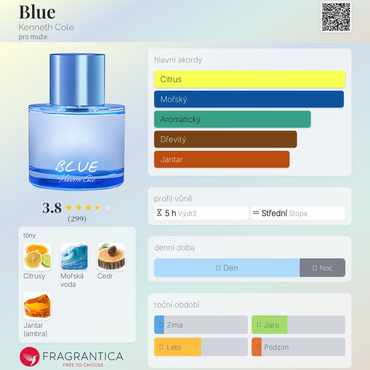 Blue podle Kenneth Cole je Aromatic vůně pro muže. Blue byl/a uveden/a v roce 2015. "Nosem" za touto vůní je Mathieu Nardin. Vrchní tón je Citrusy ; střední tón jeMořské tóny ; základní tóny jsou Cedr a Jantar (ambra).