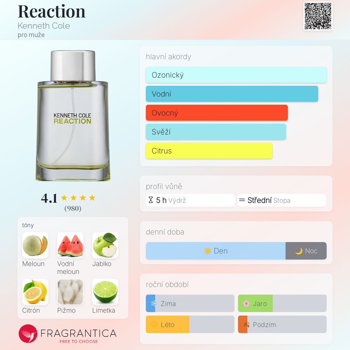 Reaction podle Kenneth Cole je Citrus Aromatic vůně pro muže. Reaction byl/a uveden/a v roce 2004. "Nosem" za touto vůní je Frank Voelkl. Vrchní tóny jsou Meloun, Vodní meloun, Zelené jablko, Citrón a Limetka; střední tóny jsouKonvalinka a Pačuli ; základní tóny jsou Pižmo a Santalové dřevo.