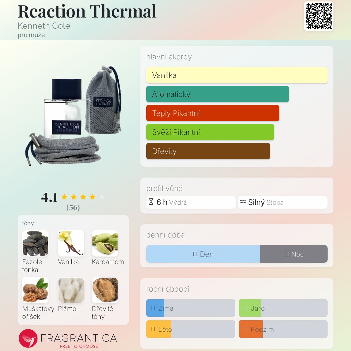Reaction Thermal podle Kenneth Cole je Woody Aromatic vůně pro muže. Reaction Thermal byl/a uveden/a v roce 2006. Vrchní tóny jsou Kardamom a Pelyněk; střední tóny jsouMuškátový oříšek, Pižmo a Levandule ; základní tóny jsou Fazole tonka, Vanilka, Dřevité tóny a Guajakové dřevo.