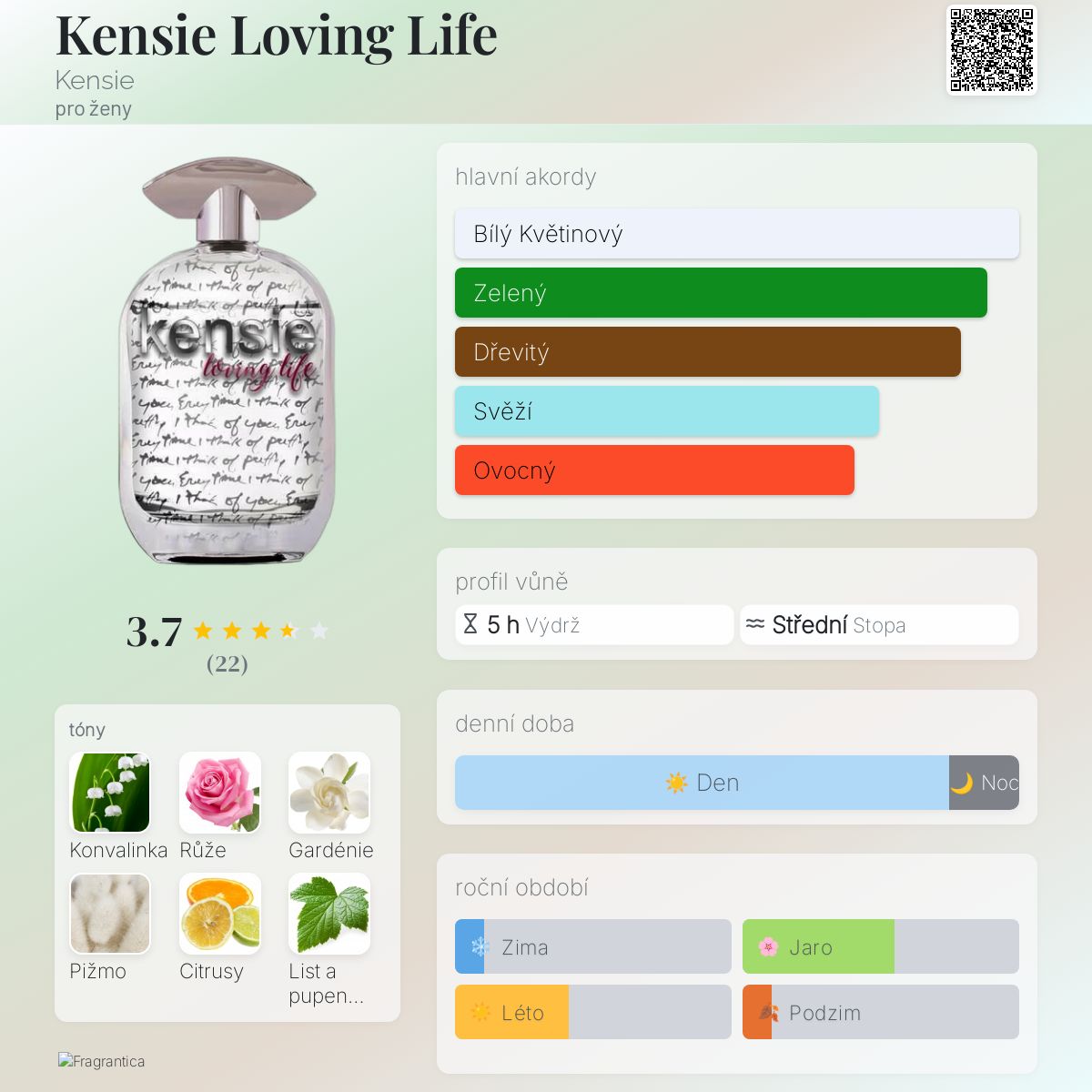 Kensie Loving Life podle Kensie je Orientální Floral vůně pro ženy. Vrchní tóny jsou Citrusy, Černý rybíz, Kapka rosy, Zelené tóny, Lesní plody, Jablko a Broskev; střední tóny jsouKonvalinka, Růže, Gardénie, Narcis a Jasmín ; základní tóny jsou Pižmo, Cedr, Santalové dřevo, Vetiver, Vanilka a Fazole tonka.