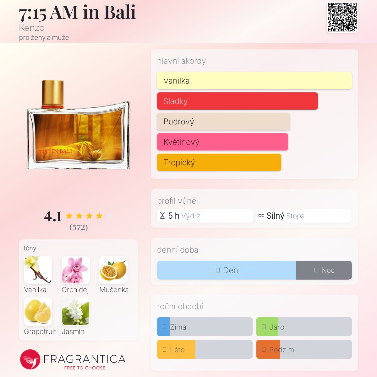 7:15 AM in Bali podle Kenzo je Floral Fruity vůně pro ženy a muže. 7:15 AM in Bali byl/a uveden/a v roce 2008. "Nosem" za touto vůní je Daphné Bugey. Vrchní tóny jsou Mučenka a Grapefruit; střední tóny jsouOrchidej a Jasmín ; základní tón je Vanilka.