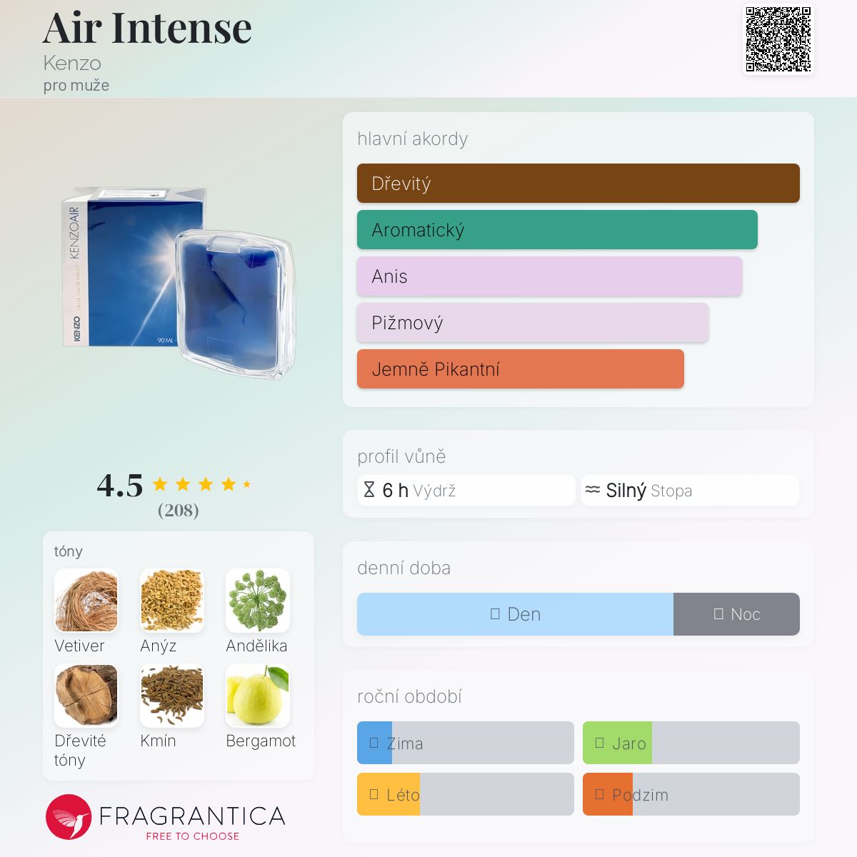Air Intense podle Kenzo je Woody Aromatic vůně pro muže. Air Intense byl/a uveden/a v roce 2005. "Nosem" za touto vůní je Maurice Roucel. Vrchní tóny jsou Anýz, Kmín a Bergamot; střední tóny jsouTahitský vetiver a Andělika ; základní tóny jsou Vetiver, Bílé dřevo a Jantar (ambra).