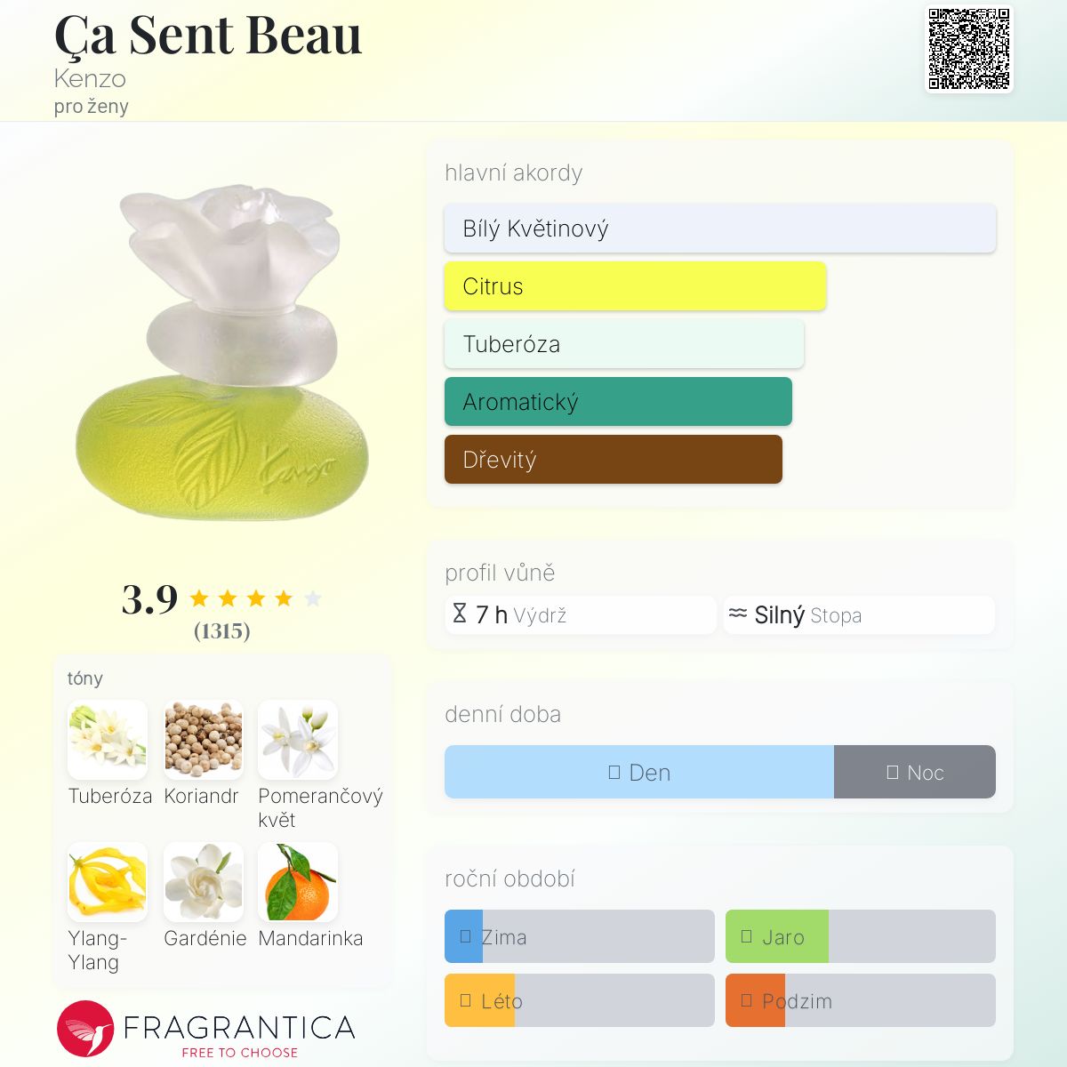 Ça Sent Beau podle Kenzo je Floral Fruity vůně pro ženy. Ça Sent Beau byl/a uveden/a v roce 1997. "Nosem" za touto vůní je Francoise Caron. Vrchní tóny jsou Mandarinka, Pačuli a Bergamot; střední tóny jsouTuberóza, Koriandr, Květ afrického pomeranče, Ylang-Ylang, Gardénie, Jasmín a Broskev ; základní tóny jsou Vetiver, Jantar (ambra) a Vanilka.