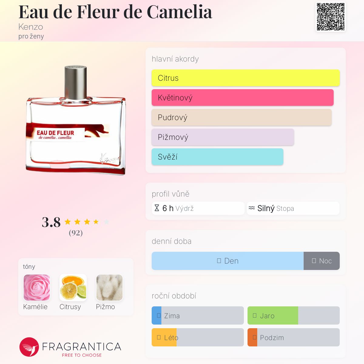 Eau de Fleur de Camelia podle Kenzo je Floral vůně pro ženy. Eau de Fleur de Camelia byl/a uveden/a v roce 2011. "Nosem" za touto vůní je Jean Jacques. Vrchní tón je Citrusy ; střední tón jeKamélie ; základní tón je Pižmo.