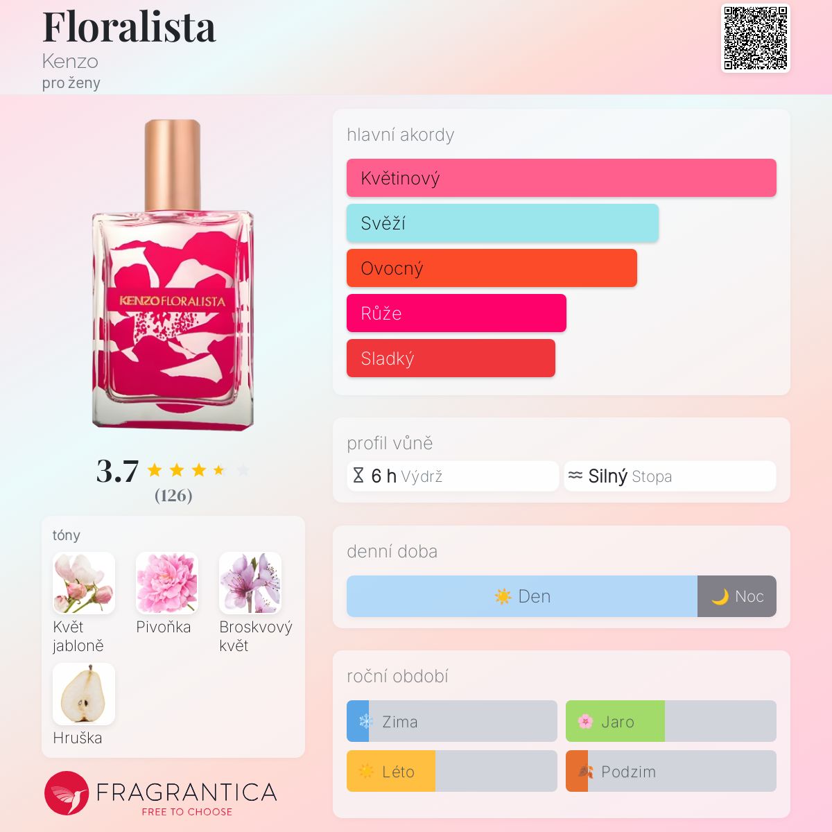 Floralista podle Kenzo je Floral vůně pro ženy. Floralista byl/a uveden/a v roce 2014. Vrchní tón je Květ jabloně ; střední tóny jsouPivoňka a Hruška ; základní tón je Broskvový květ.