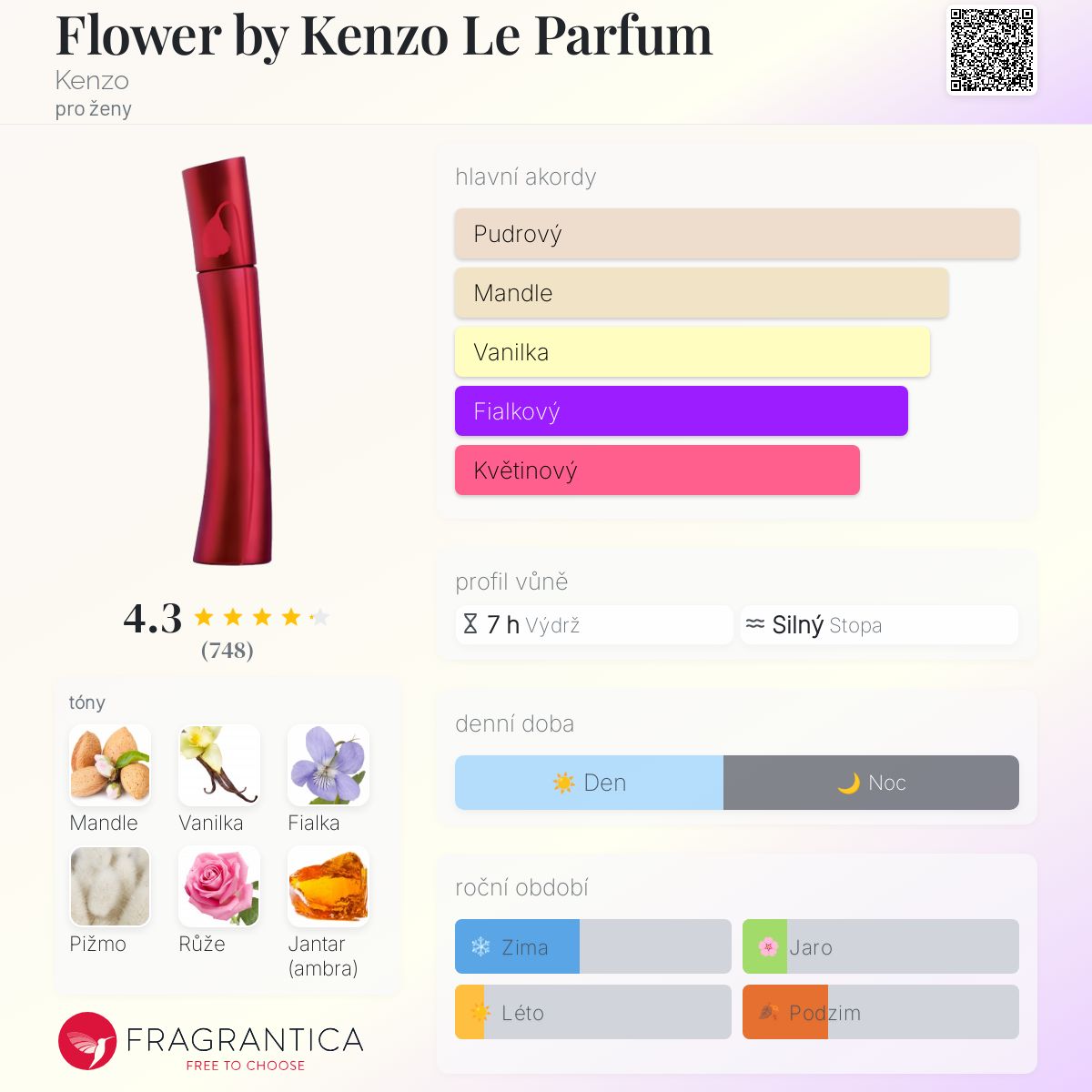 Flower by Kenzo Le Parfum podle Kenzo je Floral Woody Musk vůně pro ženy. Flower by Kenzo Le Parfum byl/a uveden/a v roce 2003. "Nosem" za touto vůní je Alberto Morillas. Vrchní tón je Černý rybíz ; střední tóny jsouMandle, Fialka a Růže ; základní tóny jsou Vanilka, Bílé pižmo a Jantar (ambra).