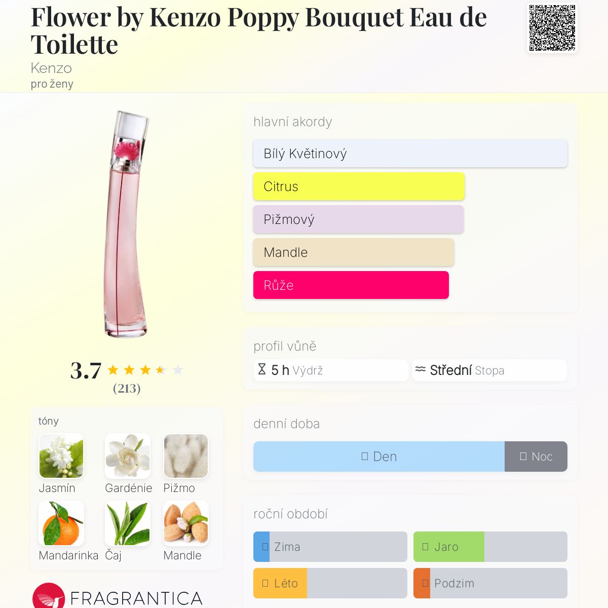 Flower by Kenzo Poppy Bouquet Eau de Toilette podle Kenzo je Floral vůně pro ženy. Flower by Kenzo Poppy Bouquet Eau de Toilette byl/a uveden/a v roce 2022. Flower by Kenzo Poppy Bouquet Eau de Toilette byl/a vytvořen/a Alberto Morillas a Dora Baghriche. Vrchní tóny jsou Mandarinka, Čajový lístek a Zelená mandle; střední tóny jsouJasmín Sambac, Gardénie a Damašská růže ; základní tóny jsou Bílé pižmo a Cedr.