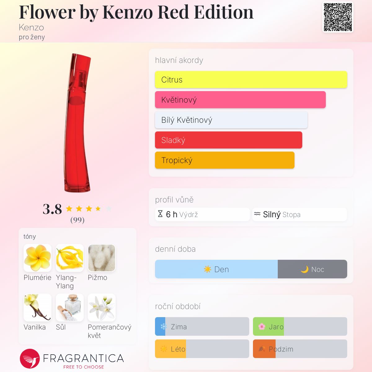 Flower by Kenzo Red Edition podle Kenzo je Floral vůně pro ženy. Flower by Kenzo Red Edition byl/a uveden/a v roce 2018. "Nosem" za touto vůní je Alberto Morillas. Vrchní tóny jsou Bergamot, Krvavá mandarinka a Pomeranč; střední tóny jsouPlumérie, Ylang-Ylang, Pomerančový květ, Jasmín a Broskev ; základní tóny jsou Bílé pižmo, Vanilka, Mořská sůl a Pačuli.