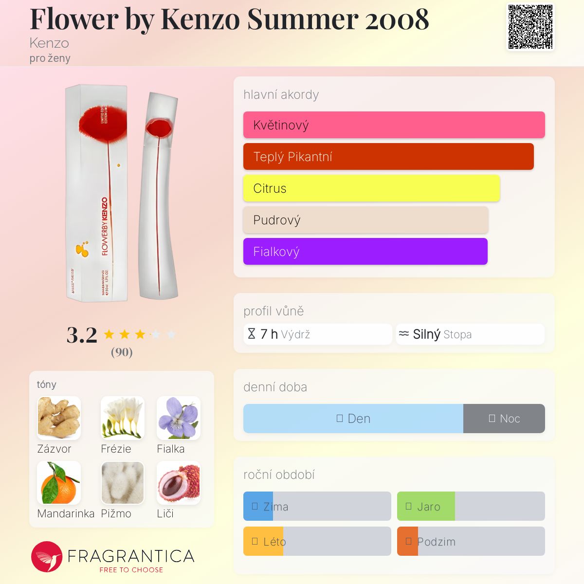 Flower by Kenzo Summer 2008 podle Kenzo je Orientální Floral vůně pro ženy. Flower by Kenzo Summer 2008 byl/a uveden/a v roce 2008. "Nosem" za touto vůní je Alberto Morillas. Vrchní tóny jsou Zázvor, Mandarinka a Liči; střední tóny jsouFrézie a Parmská fialka ; základní tóny jsou Bílé pižmo a Kadidlo.