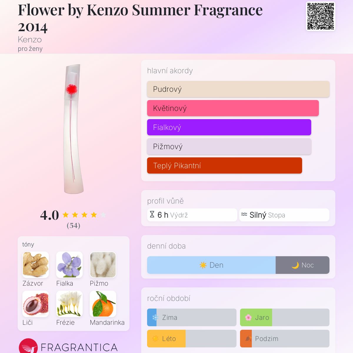 Flower by Kenzo Summer Fragrance 2014 podle Kenzo je Floral Fruity vůně pro ženy. Flower by Kenzo Summer Fragrance 2014 byl/a uveden/a v roce 2014. Vrchní tóny jsou Zázvor, Liči a Mandarinka; střední tóny jsouFialka a Frézie ; základní tón je Bílé pižmo.