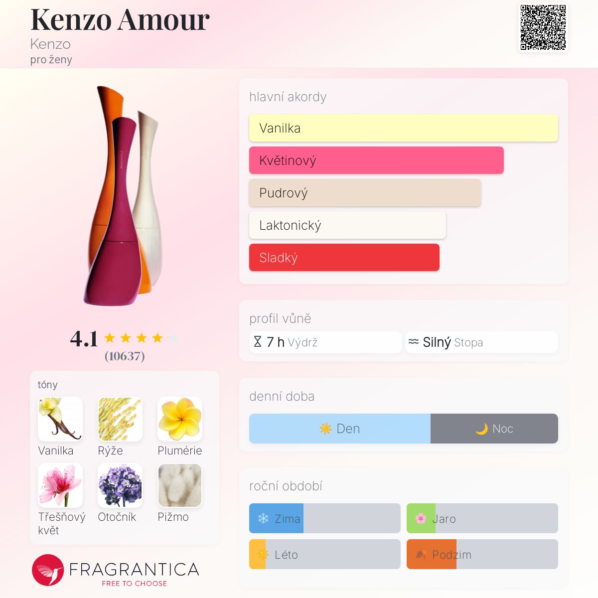 Kenzo Amour podle Kenzo je Orientální Vanilla vůně pro ženy. Kenzo Amour byl/a uveden/a v roce 2006. Kenzo Amour byl/a vytvořen/a Daphné Bugey a Olivier Cresp. Vrchní tóny jsou Rýže a Bílý čaj; střední tóny jsouPlumérie, Třešňový květ a Otočník ; základní tóny jsou Vanilka, Pižmo, Kadidlo a Dřevo Thanaka. Tento parfém je vítězem 2 ocenění: FiFi Award Fragrance Of The Year Women`s Nouveau Niche 2007 a FiFi Award Best Packaging Women`s Luxe 2007 .