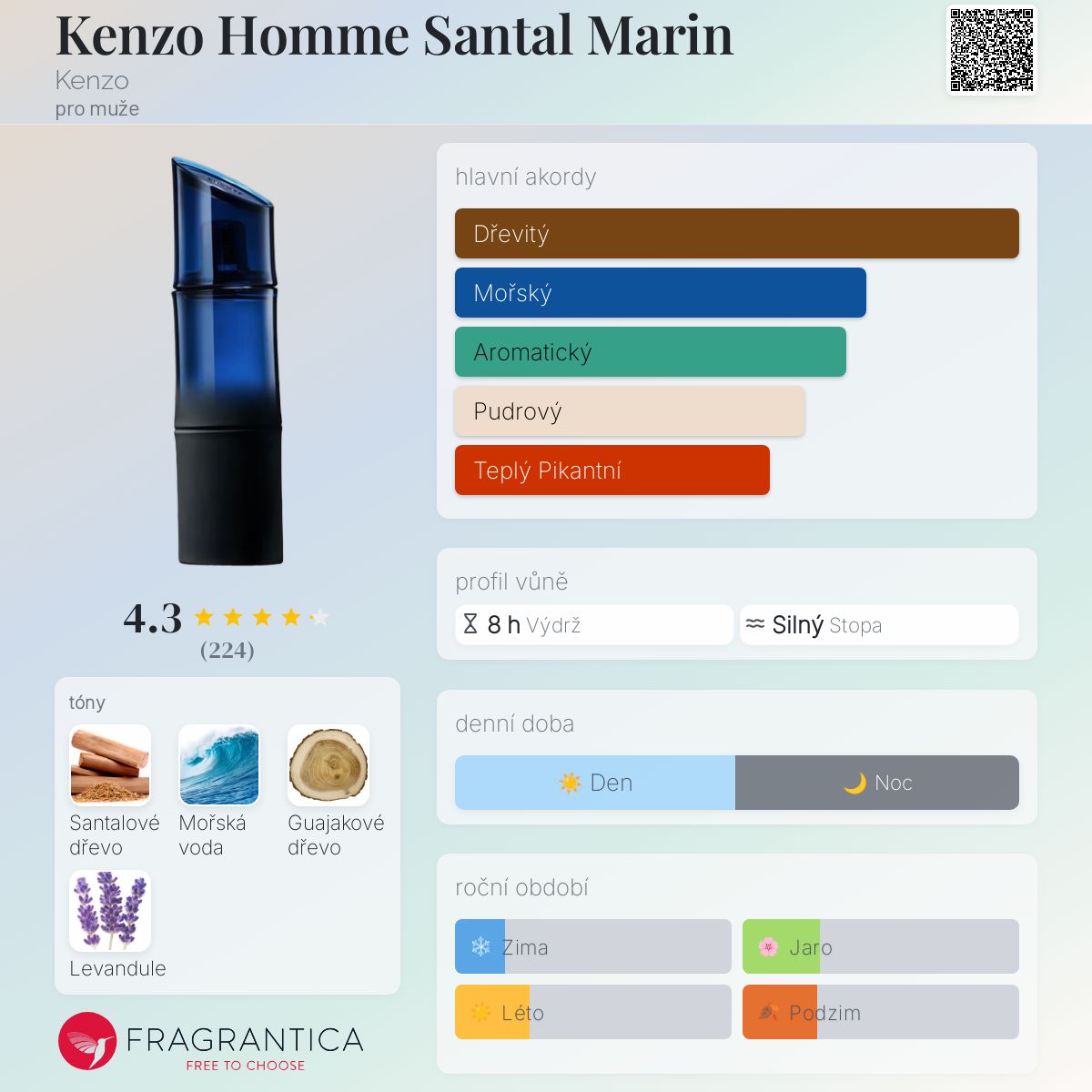 Kenzo Homme Santal Marin podle Kenzo je Woody Aquatic vůně pro muže. Toto je nová vůně. Kenzo Homme Santal Marin byl/a uveden/a v roce 2024. "Nosem" za touto vůní je Quentin Bisch. Vrchní tón je Mořské tóny ; střední tón jeLevandule ; základní tóny jsou Santalové dřevo a Guajakové dřevo.