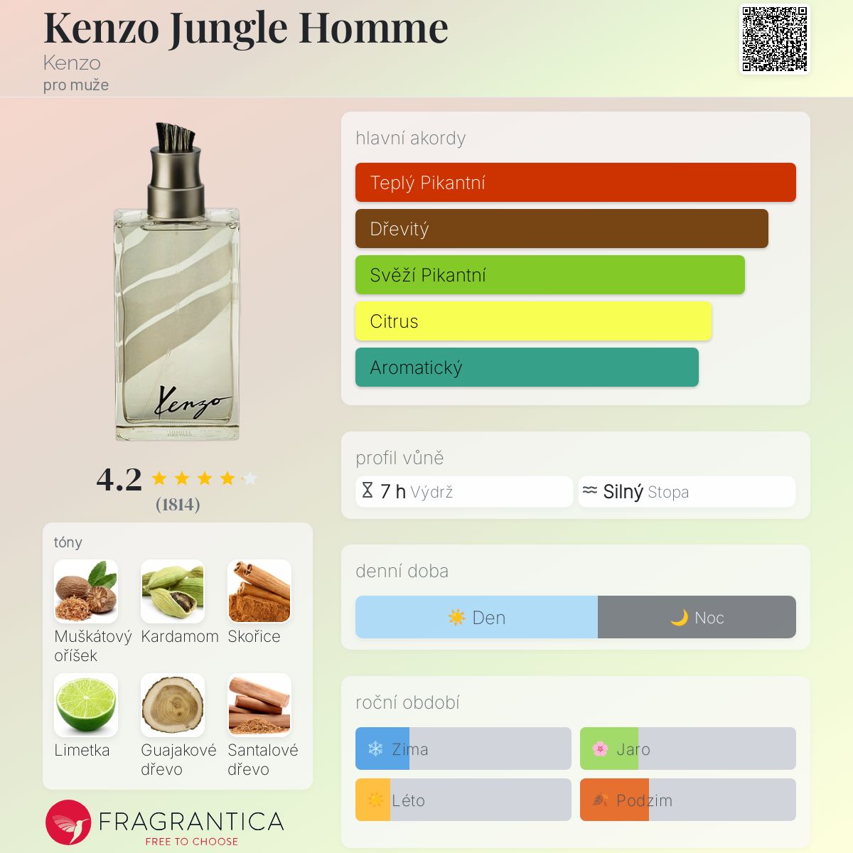Kenzo Jungle Homme podle Kenzo je Woody Spicy vůně pro muže. Kenzo Jungle Homme byl/a uveden/a v roce 1998. "Nosem" za touto vůní je Olivier Cresp. Vrchní tóny jsou Skořice, Limetka, Bergamot a Citrón; střední tóny jsouMuškátový oříšek, Kardamom, Pepř, Maté, Karafiát a Jantar (ambra) ; základní tóny jsou Guajakové dřevo, Santalové dřevo, Cedr, Benzoin a Vetiver.