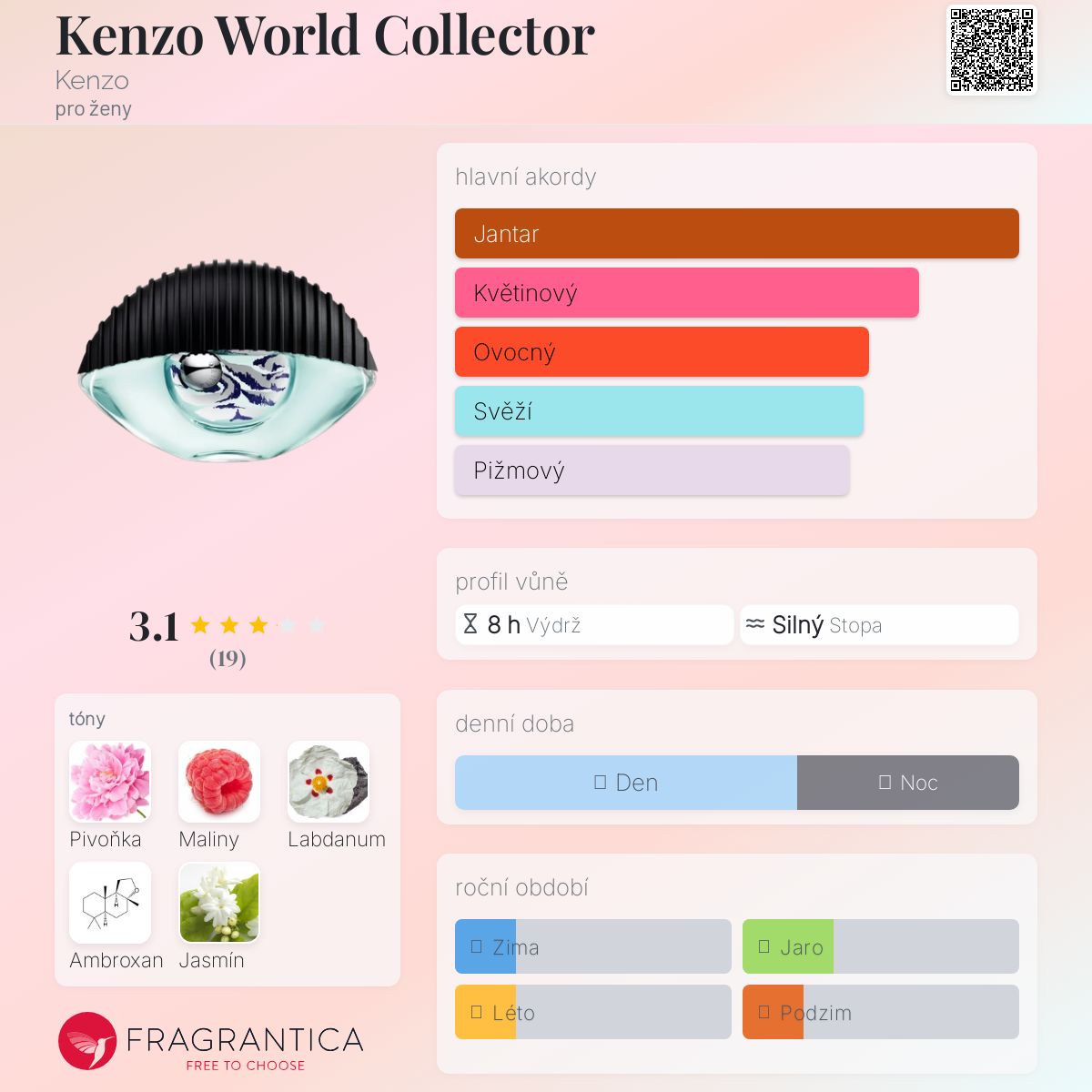 Kenzo World Collector podle Kenzo je Orientální Floral vůně pro ženy. Kenzo World Collector byl/a uveden/a v roce 2020. "Nosem" za touto vůní je Francis Kurkdjian. Vrchní tóny jsou Pivoňka a Maliny; střední tón jeJasmín ; základní tóny jsou Labdanum a Ambroxan.