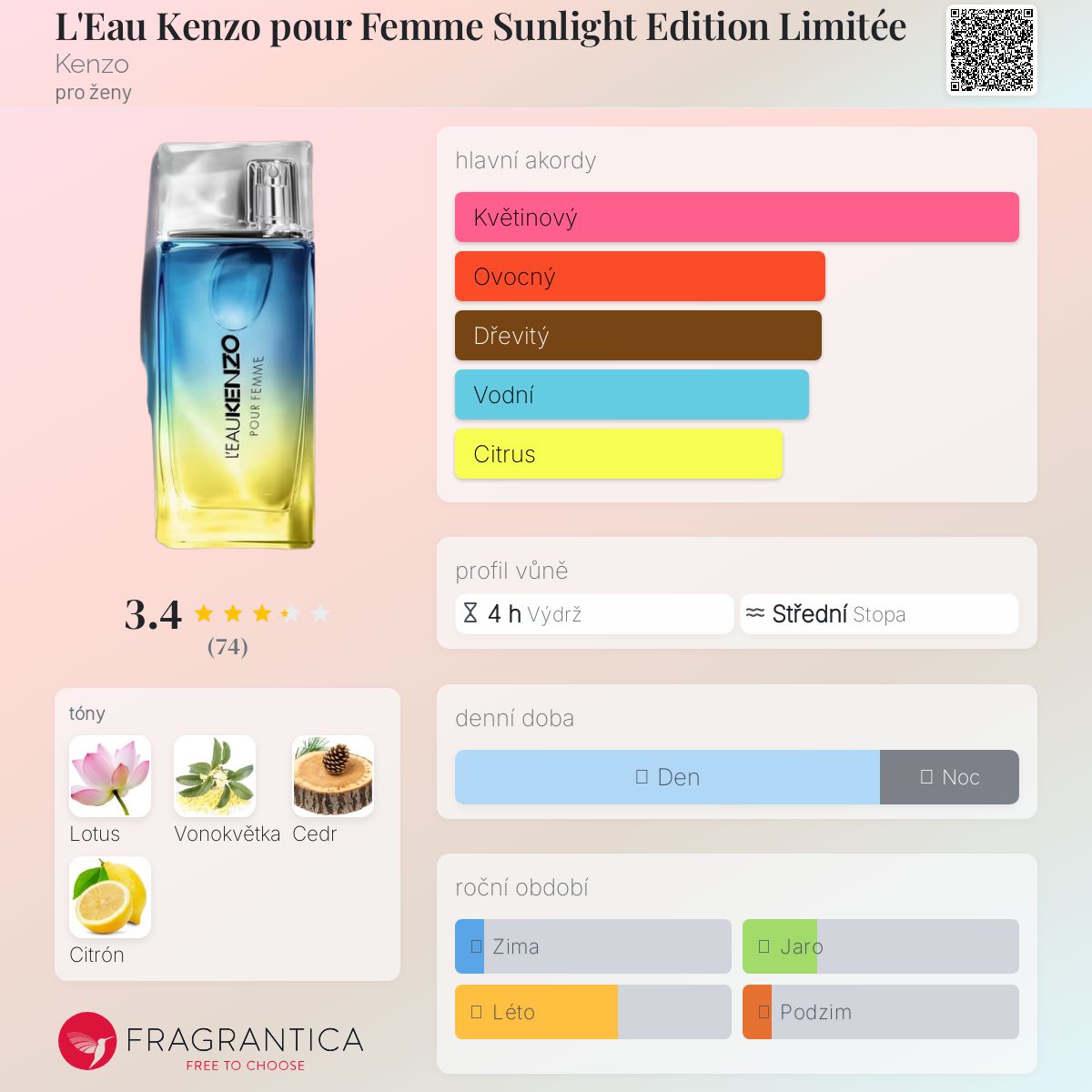 L'Eau Kenzo pour Femme Sunlight Edition Limitée podle Kenzo je Floral Aquatic vůně pro ženy. L'Eau Kenzo pour Femme Sunlight Edition Limitée byl/a uveden/a v roce 2023. "Nosem" za touto vůní je Olivier Cresp. Vrchní tón je Citrón ; střední tóny jsouLotus a Vonokvětka ; základní tón je Cedr.