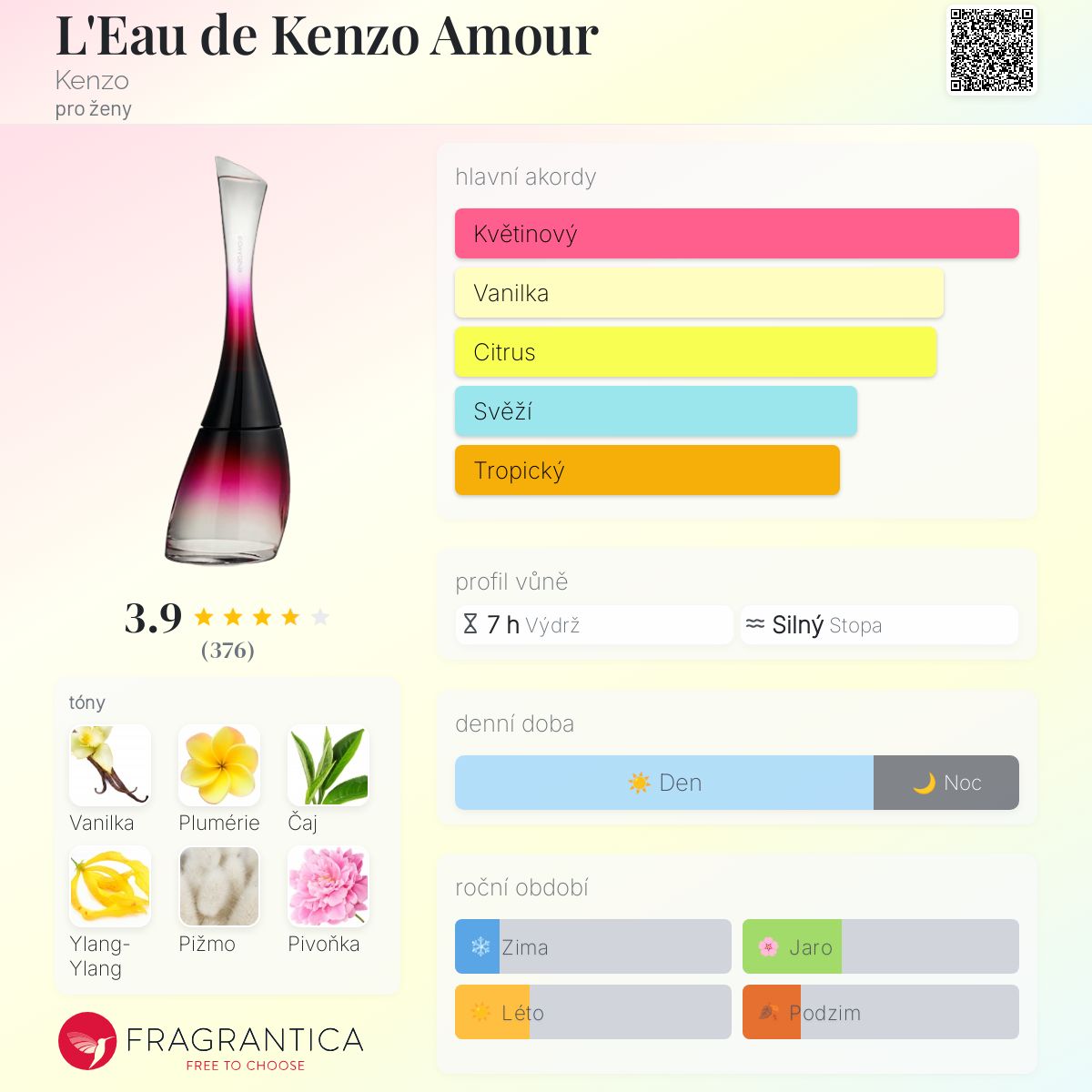 L'Eau de Kenzo Amour podle Kenzo je Floral vůně pro ženy. L'Eau de Kenzo Amour byl/a uveden/a v roce 2011. Vrchní tóny jsou Čaj, Hořký pomeranč a Bergamot; střední tóny jsouPlumérie, Ylang-Ylang a Pivoňka ; základní tóny jsou Vanilka a Pižmo.