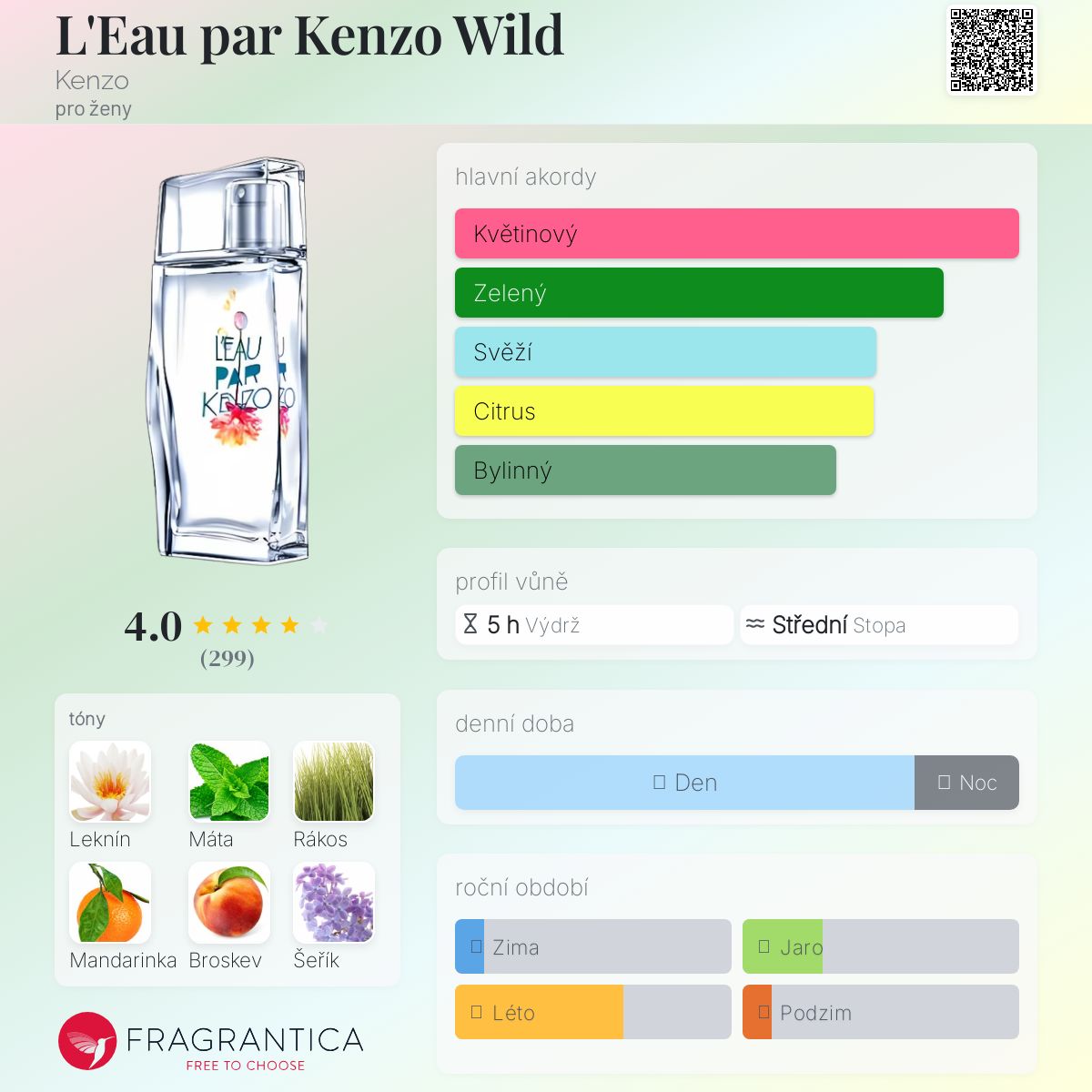 L'Eau par Kenzo Wild podle Kenzo je Floral Fruity vůně pro ženy. L'Eau par Kenzo Wild byl/a uveden/a v roce 2011. "Nosem" za touto vůní je Olivier Cresp. Vrchní tóny jsou Máta, Rákos, Mandarinka, Šeřík a Zázvor; střední tóny jsouLeknín, Broskev, Amarylka, Jasmín, Konvalinka a Růže ; základní tóny jsou Virginský cedr, Pižmo a Vanilka.