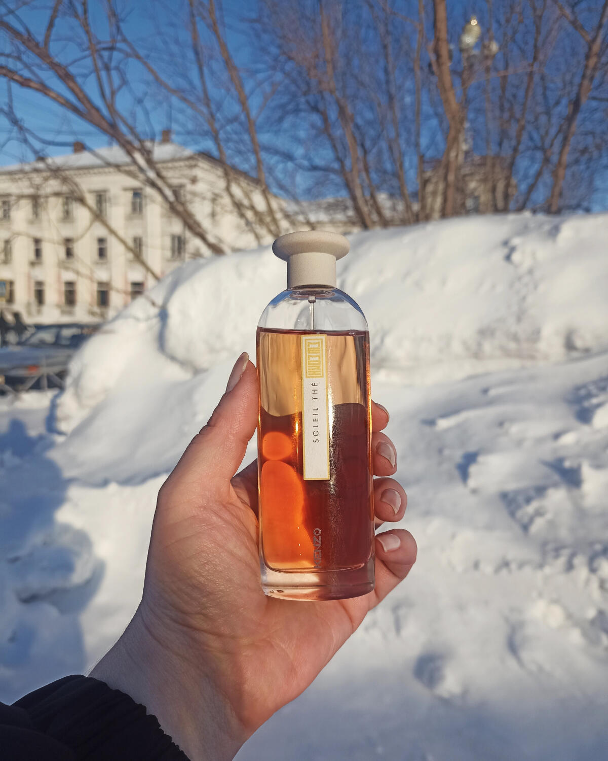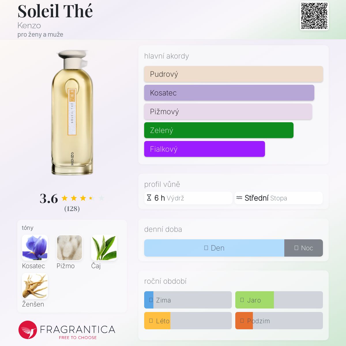 Soleil Thé podle Kenzo je Floral Woody Musk vůně pro ženy a muže. Soleil Thé byl/a uveden/a v roce 2022. "Nosem" za touto vůní je Jérôme di Marino. Vrchní tóny jsou Čaj a Ženšen; střední tón jeKosatec ; základní tón je Bílé pižmo.