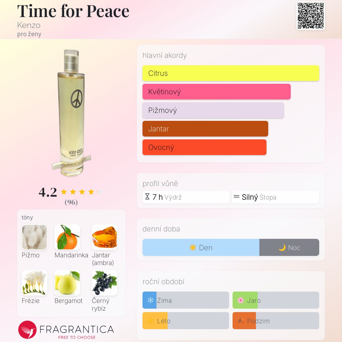 Time for Peace podle Kenzo je Floral vůně pro ženy. Time for Peace byl/a uveden/a v roce 1999. Vrchní tóny jsou Mandarinka, Bergamot a Černý rybíz; střední tóny jsouFrézie a Jasmín ; základní tóny jsou Pižmo a Jantar (ambra).