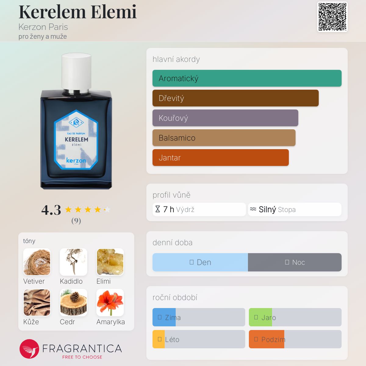 Kerelem Elemi podle Kerzon Paris je Woody Aromatic vůně pro ženy a muže. Vrchní tóny jsou Kadidlo, Atlasový cedr a Amarylka; střední tón jeElimi ; základní tóny jsou Haitský vetiver, Vetiver a Kůže.