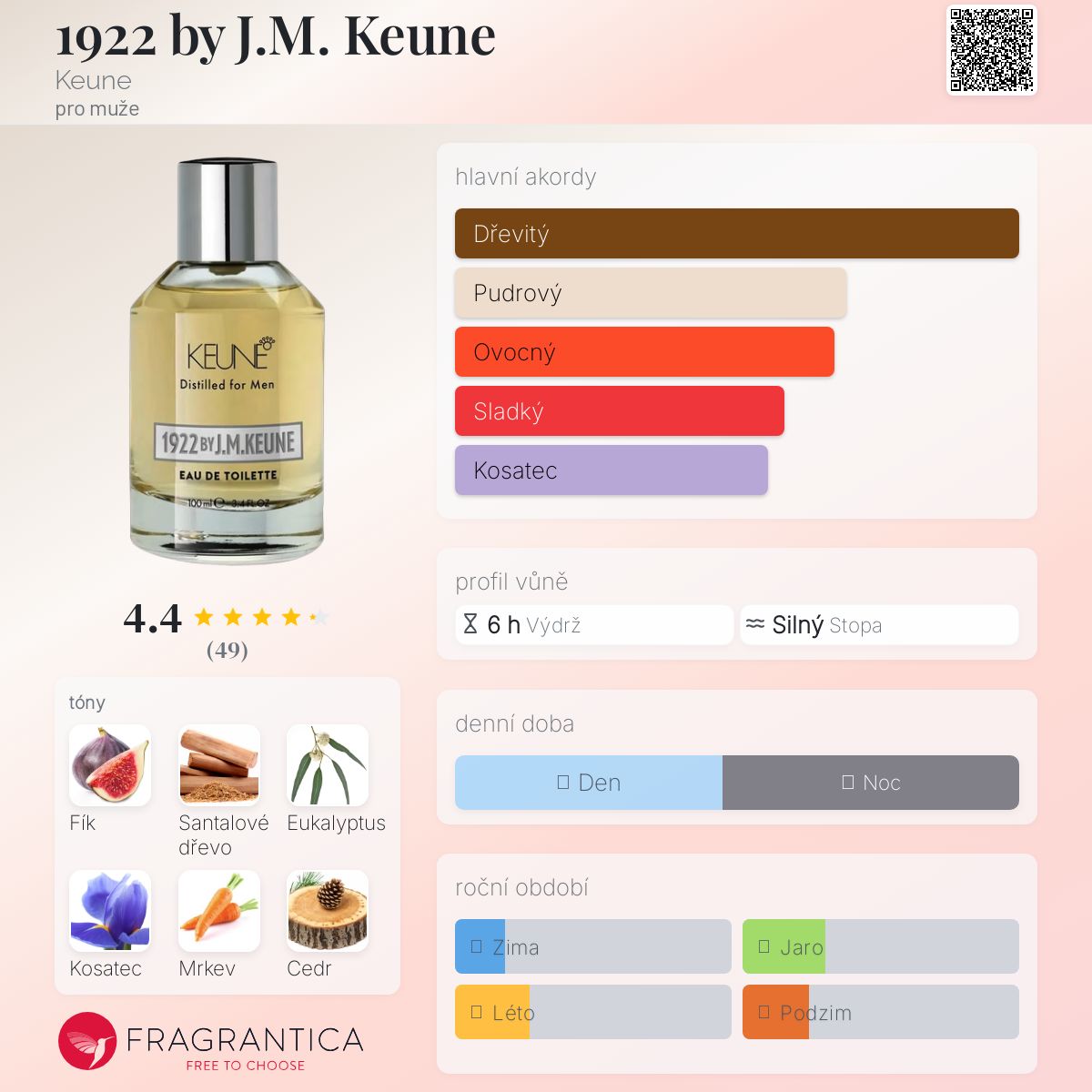 1922 by J.M. Keune podle Keune je Aromatic vůně pro muže. 1922 by J.M. Keune byl/a uveden/a v roce 2020. "Nosem" za touto vůní je George Keune. Vrchní tóny jsou Fík, Eukalyptus, Mrkev a Kardamom; střední tóny jsouSantalové dřevo, Kosatec, Cedr a Kumarin ; základní tóny jsou Pižmo, Kůže, Naplavené dříví a Papyrus.