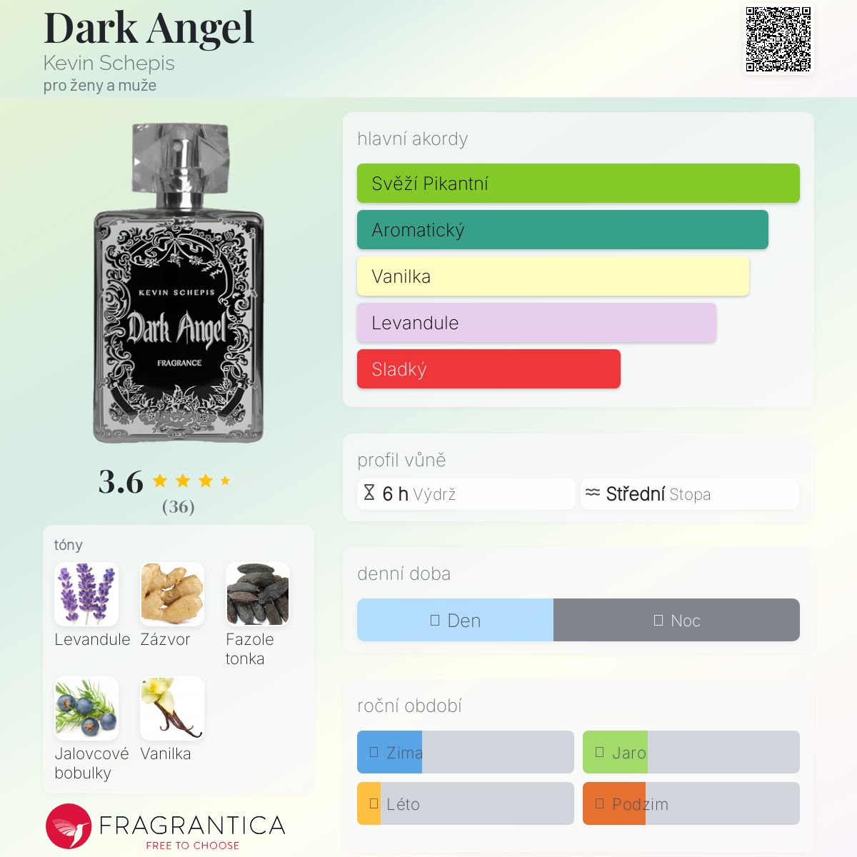 Dark Angel podle Kevin Schepis je Aromatic vůně pro ženy a muže. Dark Angel byl/a uveden/a v roce 2023. Vrchní tóny jsou Zázvor a Jalovcové bobulky; střední tón jeLevandule ; základní tóny jsou Fazole tonka a Vanilka.