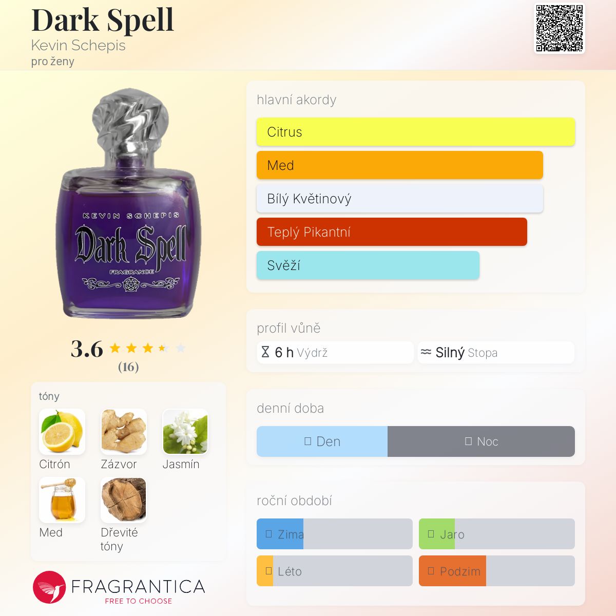 Dark Spell podle Kevin Schepis je Floral vůně pro ženy. Dark Spell byl/a uveden/a v roce 2023. Vrchní tóny jsou Citrón a Zázvor; střední tón jeJasmín Sambac ; základní tóny jsou Med a Vzácné dřevo.