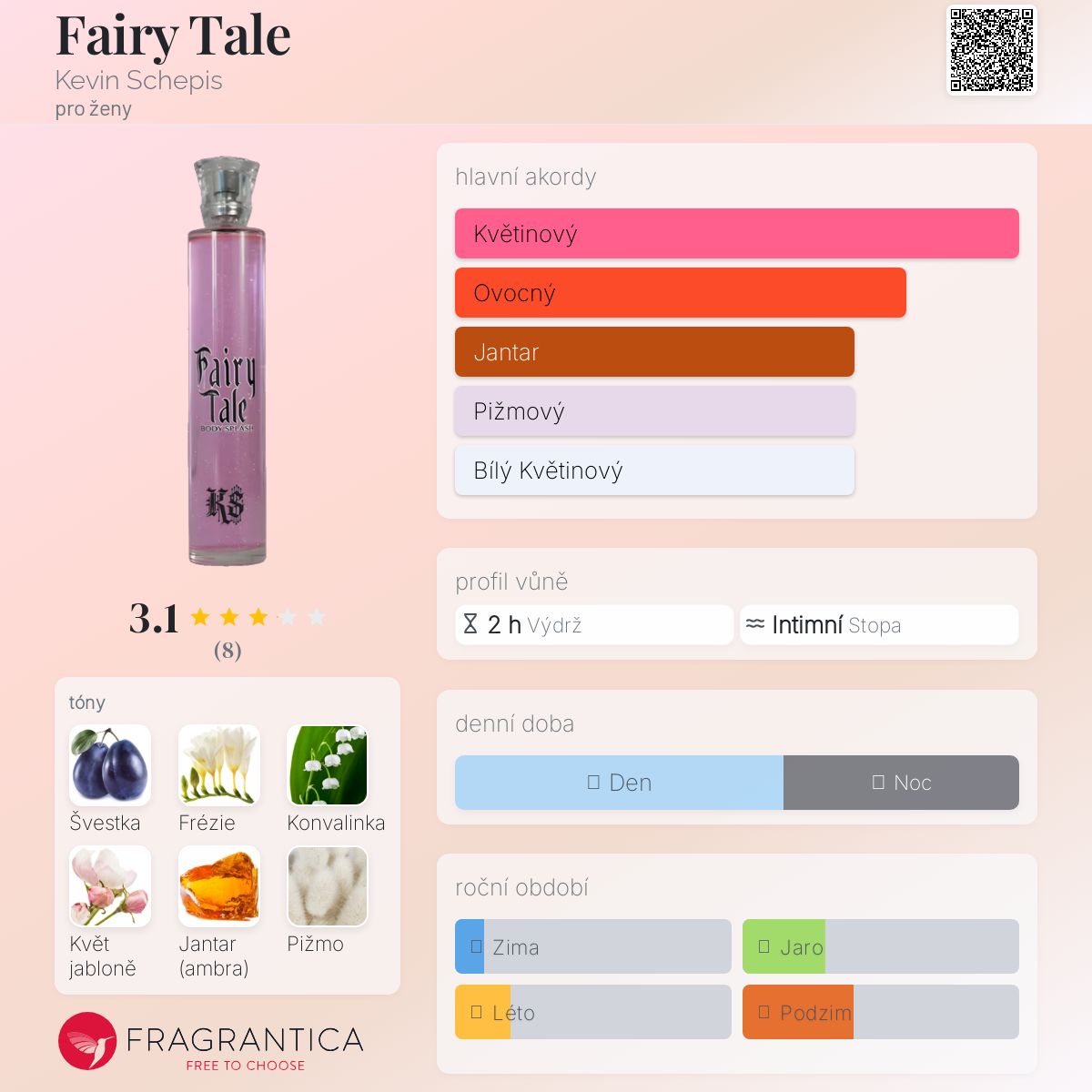 Fairy Tale podle Kevin Schepis je Floral Fruity vůně pro ženy. Fairy Tale byl/a uveden/a v roce 2023. Vrchní tóny jsou Švestka a Frézie; střední tóny jsouKonvalinka a Květ jabloně ; základní tóny jsou Jantar (ambra) a Pižmo.
